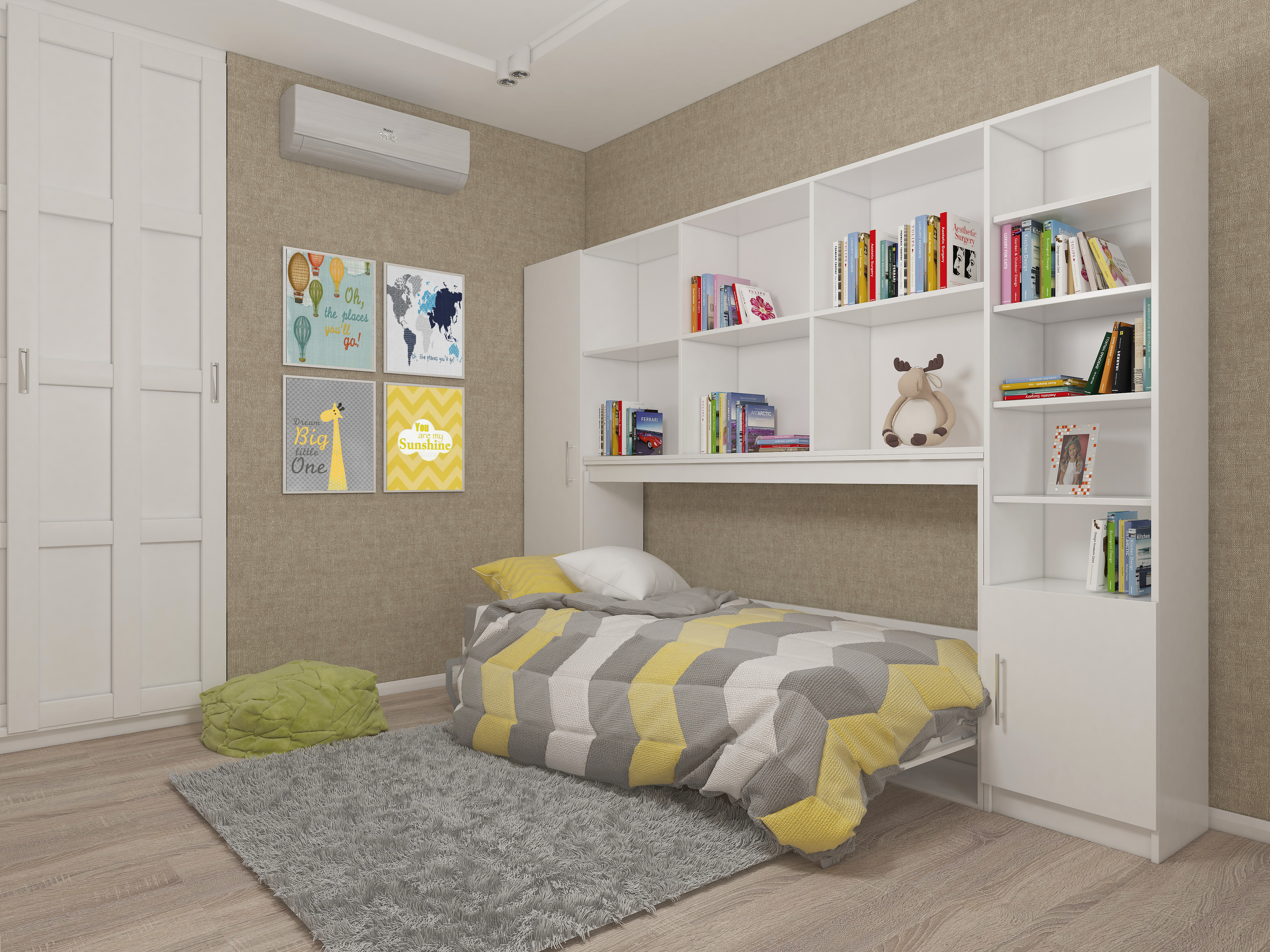 Детская кровать горизонтального сложения с навесным модулем из четырех полок.