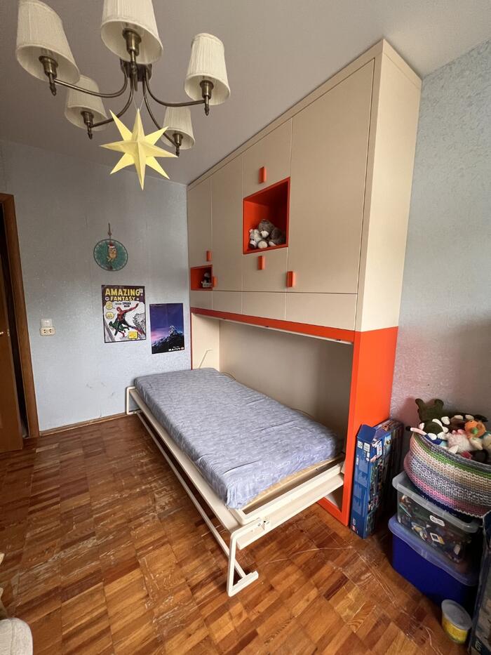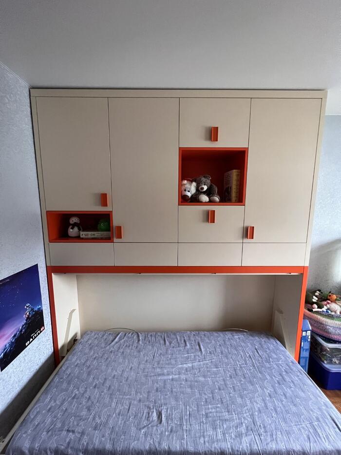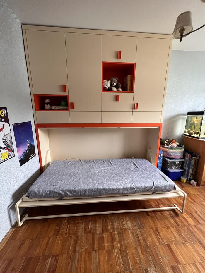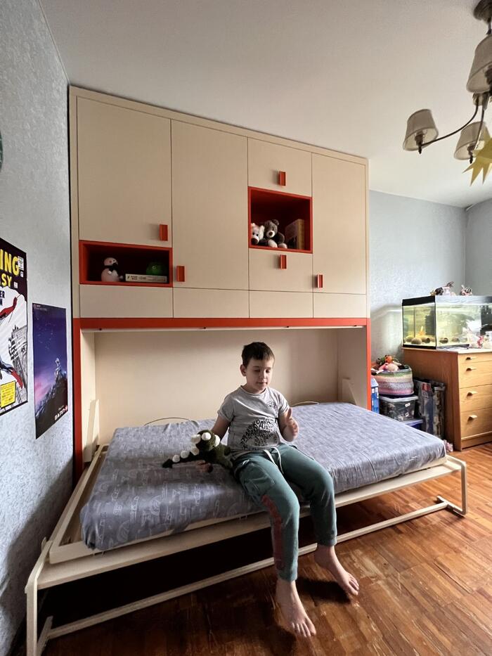 Односпальная кровать-трансформер. Горизонтальная трансформация. Дополняется шкафом, столом и комодом на заказ по индивидуальным размерам. Широкий выбор материалов.