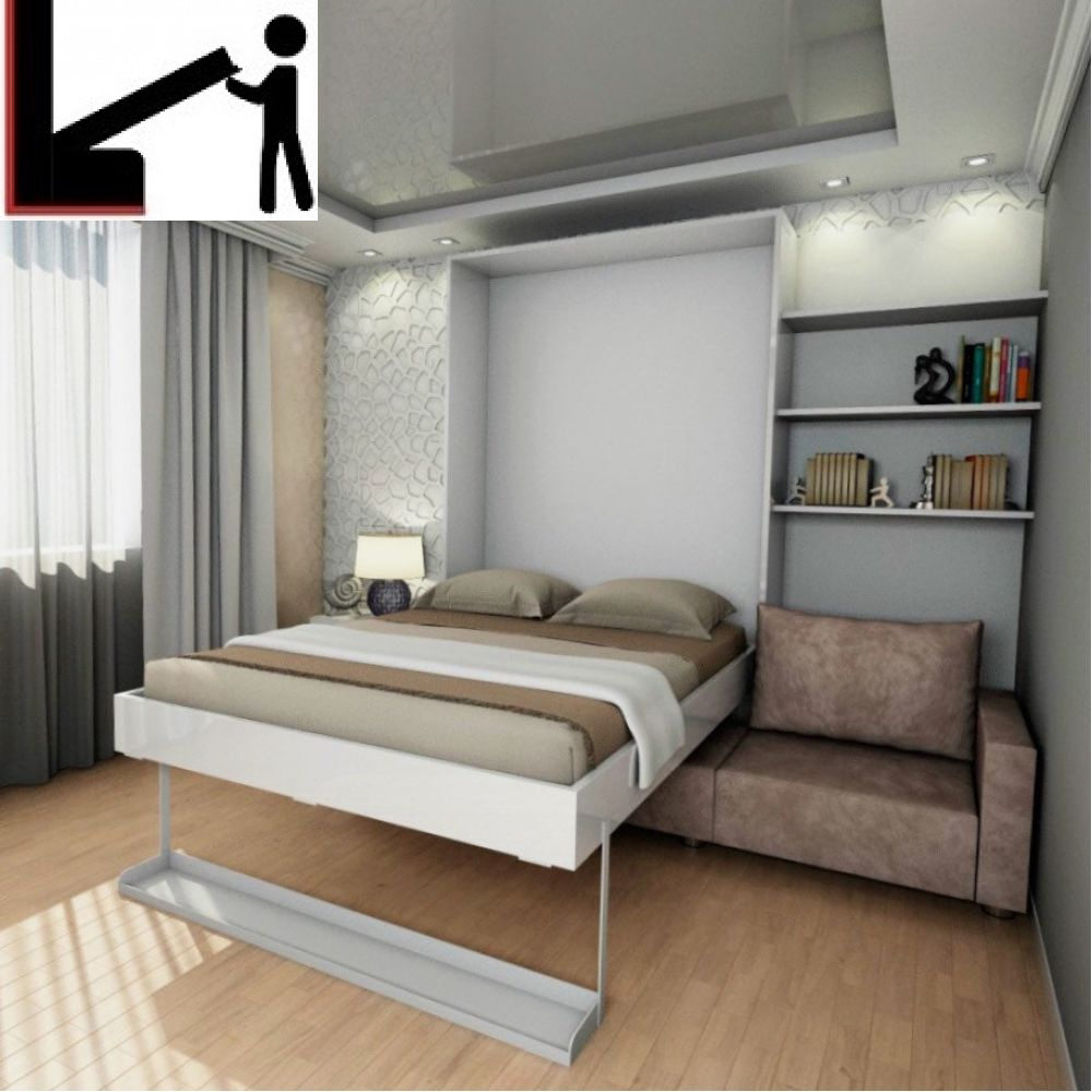 Мебель-трансформер с кроватью вертикального сложения с интегрированной полкой. Включает подсветку, мягкое изголовье и много зон хранения.