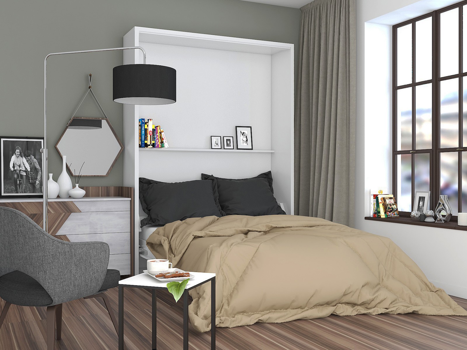 Комплект мебели включает шкаф и кровать-трансформер с диваном и закрытыми зонами для хранения из ДСП Egger.