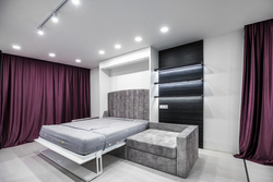 Мебель-трансформер со шкафом-кроватью горизонтального сложения. Включает шкаф, зоны хранения, диван и консоль под TV.