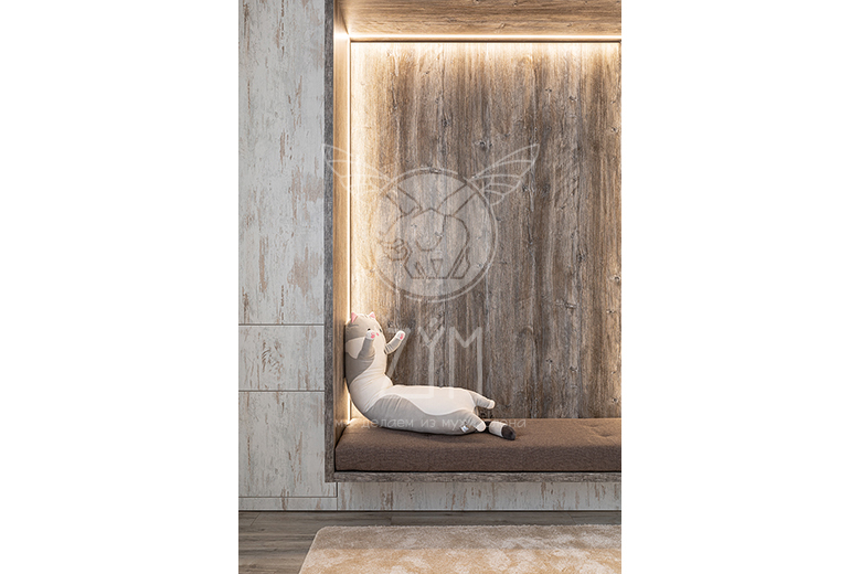 Кровать-трансформер в гостиную встроена в шкаф с подсветкой, мягким изголовьем и зонами для хранения. Материал кровати - ДСП.