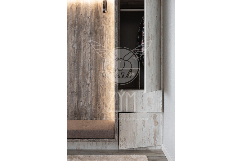 Фасады в светло-сером цвете, корпус в цвете имитирующем текстуру дерева.