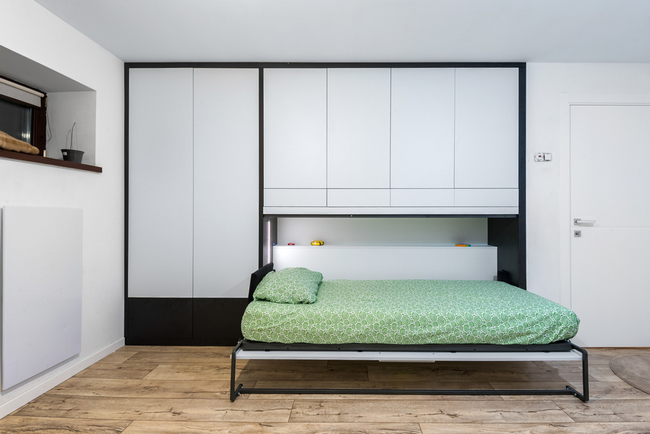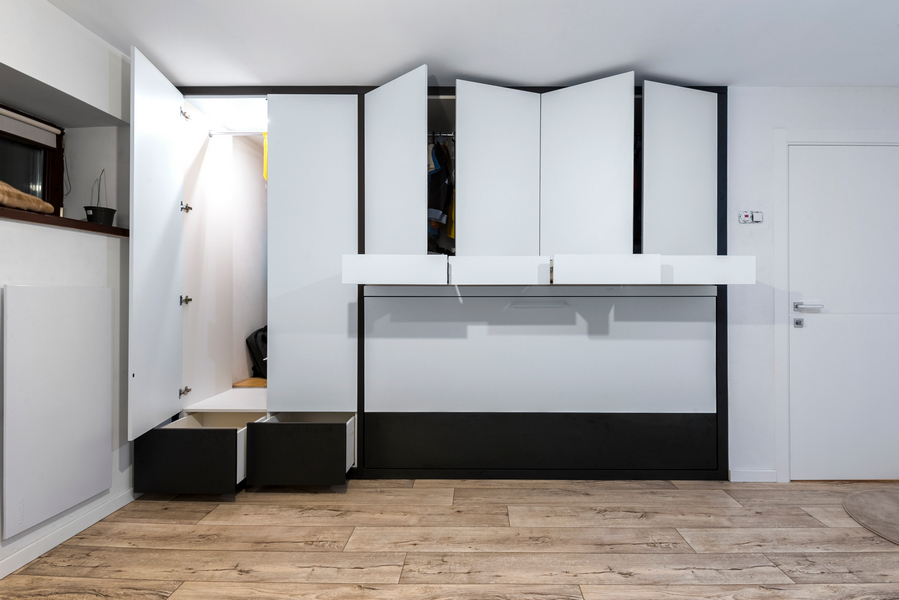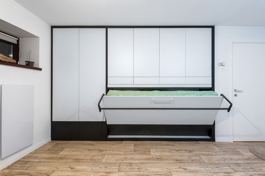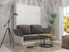 Шкаф-кровать из ДСП Egger с открытыми и закрытыми зонами для хранения и диванным модулем.