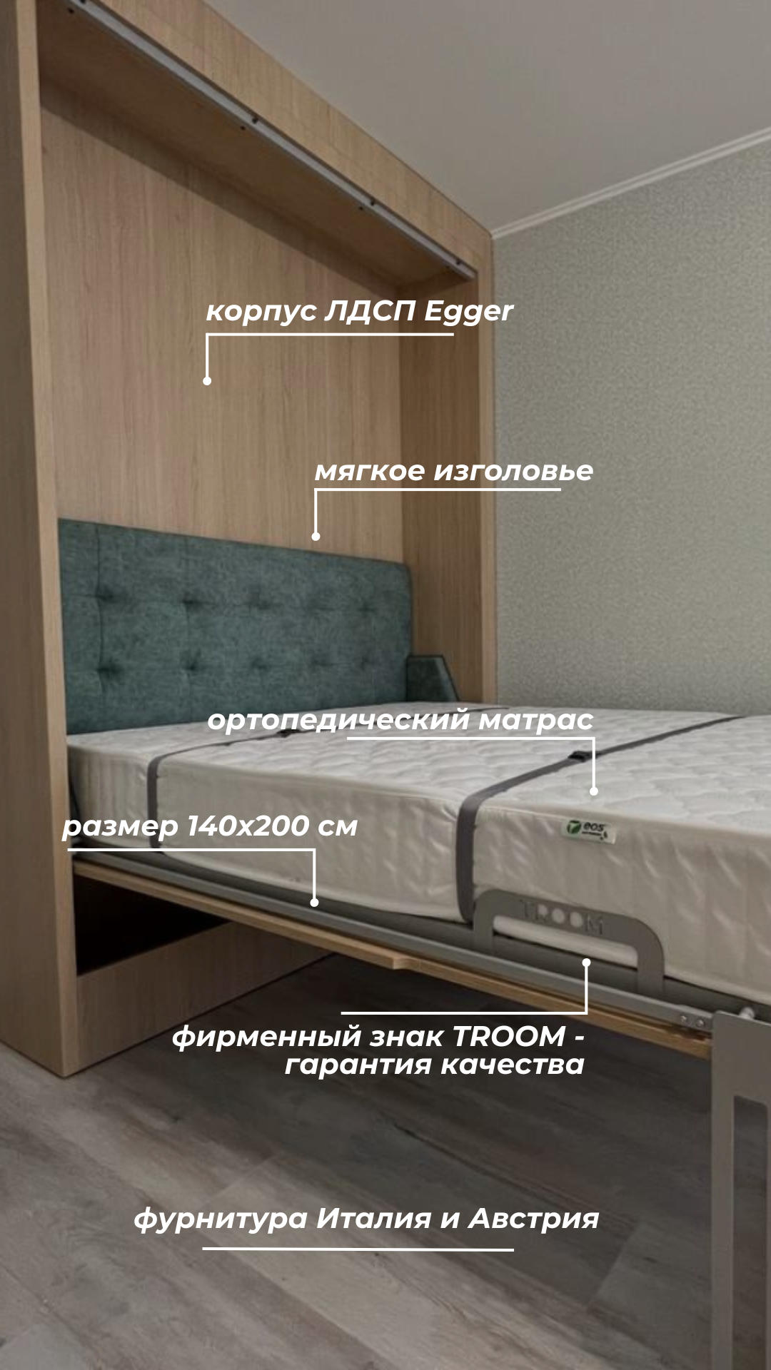 Надёжный и лёгкий механизм трансформации. Изготовление по индивидуальным размерам. Широкий выбор материалов.