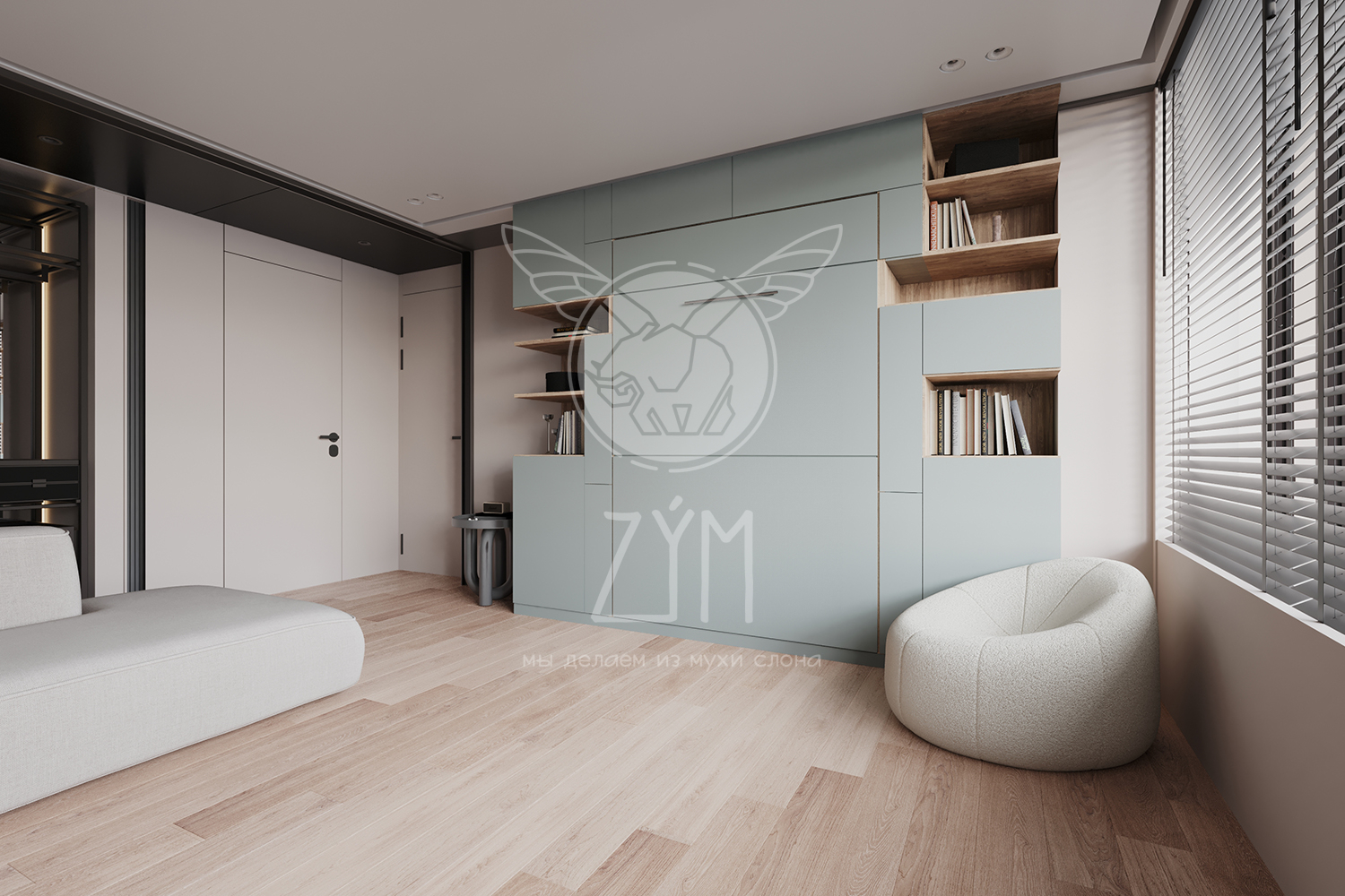 Кровать-трансформер в гостиную встроена в шкаф с подсветкой, мягким изголовьем и открытыми и закрытыми зонами для хранения. Материал кровати - ДСП.