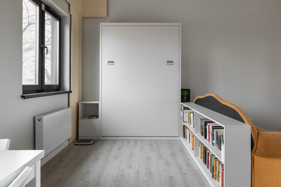 Кровать-трансформер размером спального места 1600х2000 мм вертикального сложения c механизмом Гудини. Материал изготовления ДСП. Проект «Ренн» выполнен по индивидуальному заказу. Цена на сайте указана за кровать-трансформер (матрас в стоимость не входит).