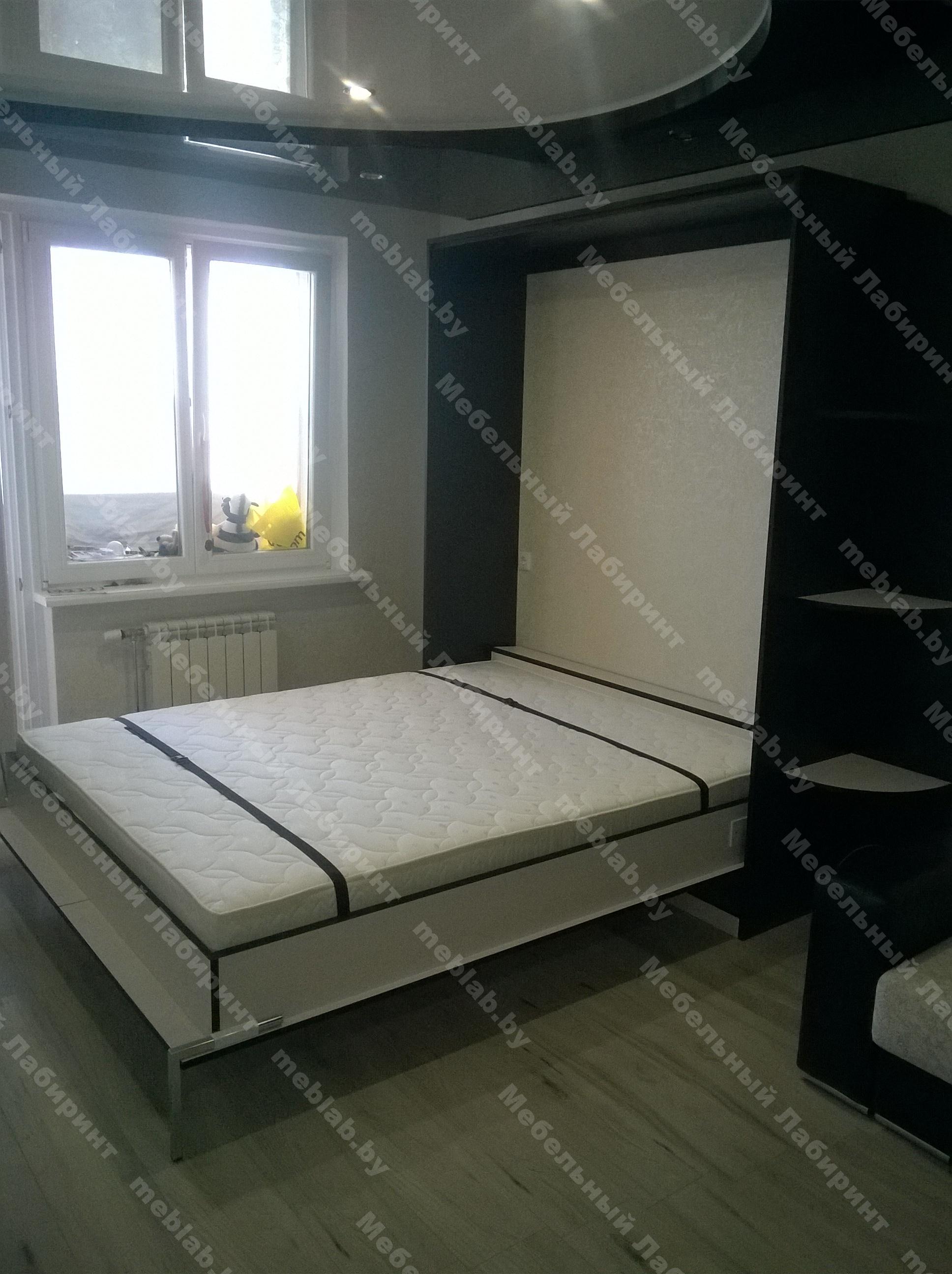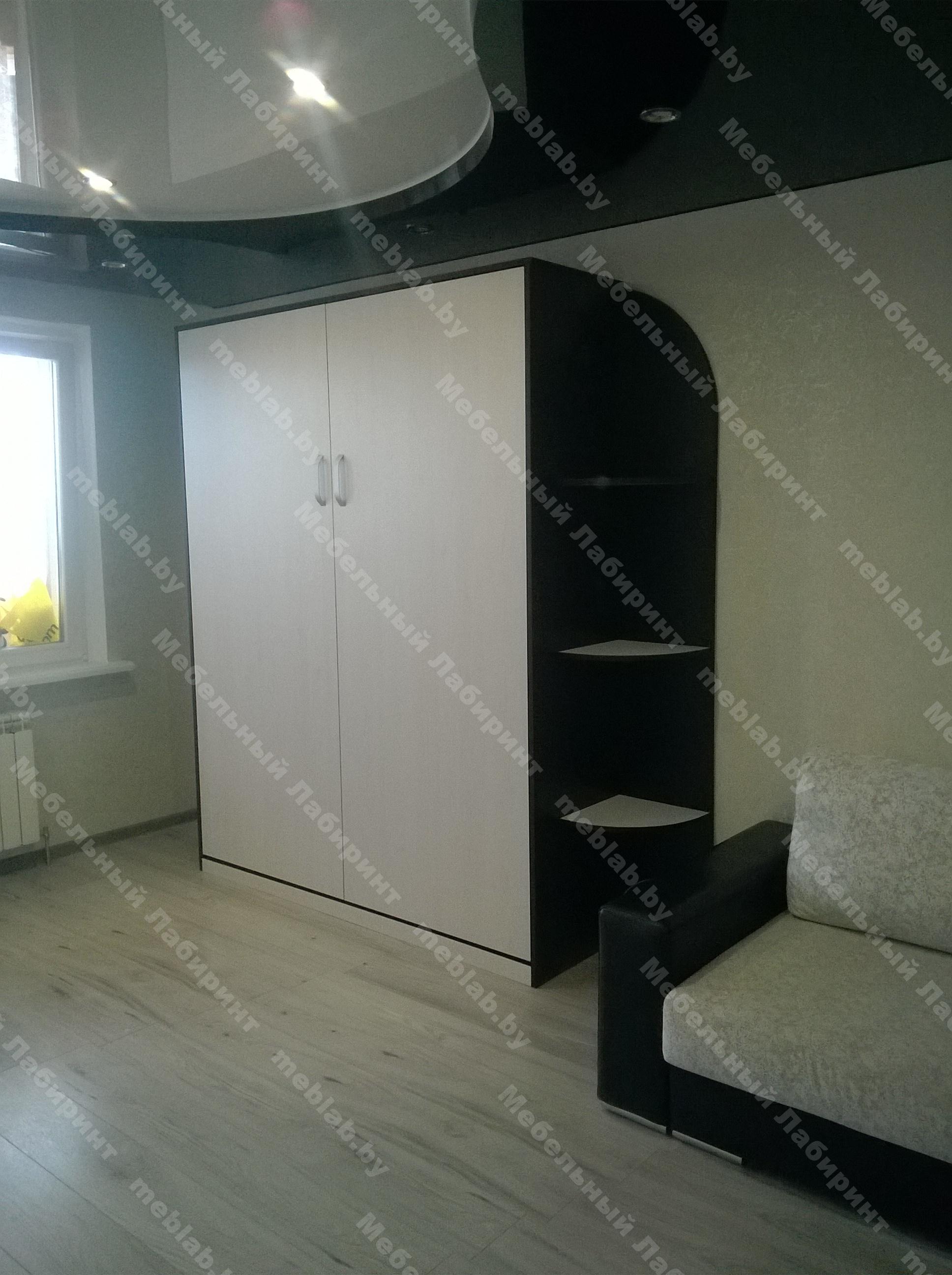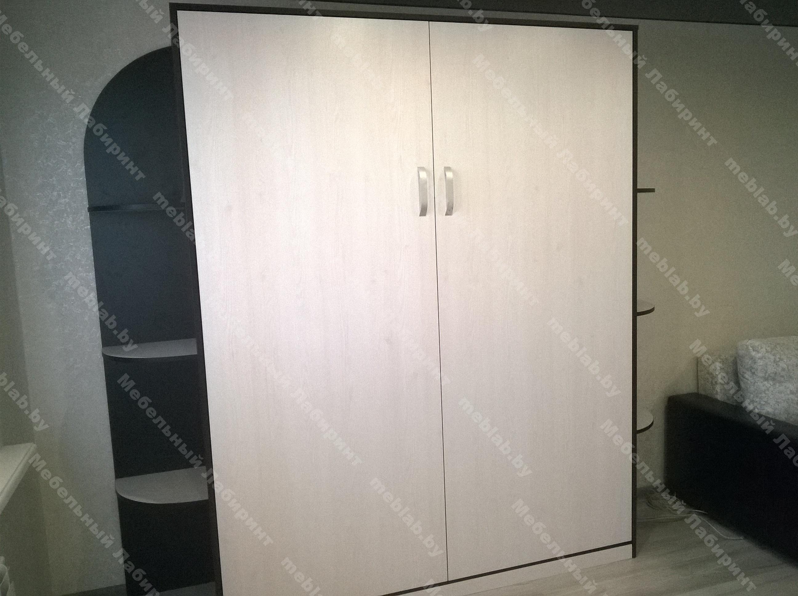 Трансформер шкаф-кровать с широким спальным местом на легком прочном основании и надежным механизмом. В корпус под темное дерево встроены округлые торцевые полки. Данный функциональный элемент мебели прекрасно подойдет для ограниченной площади спальни или зала однокомнатной квартиры.