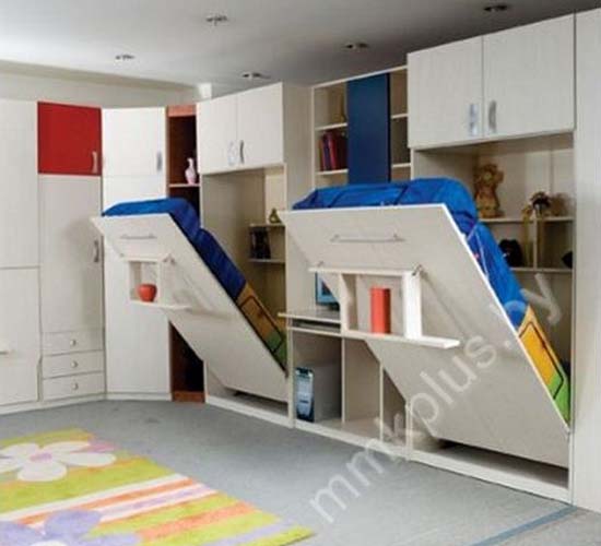 Два спальных места установлены в угловой шкаф-стеллаж, занимающий пространство возле двух смежных стен. Основной цвет фасадов: белый.