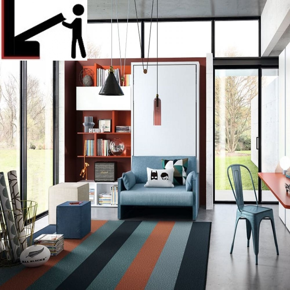 Мебель-трансформер со шкафом-кроватью горизонтального сложения. Включает шкаф, зоны хранения, диван и консоль под TV.