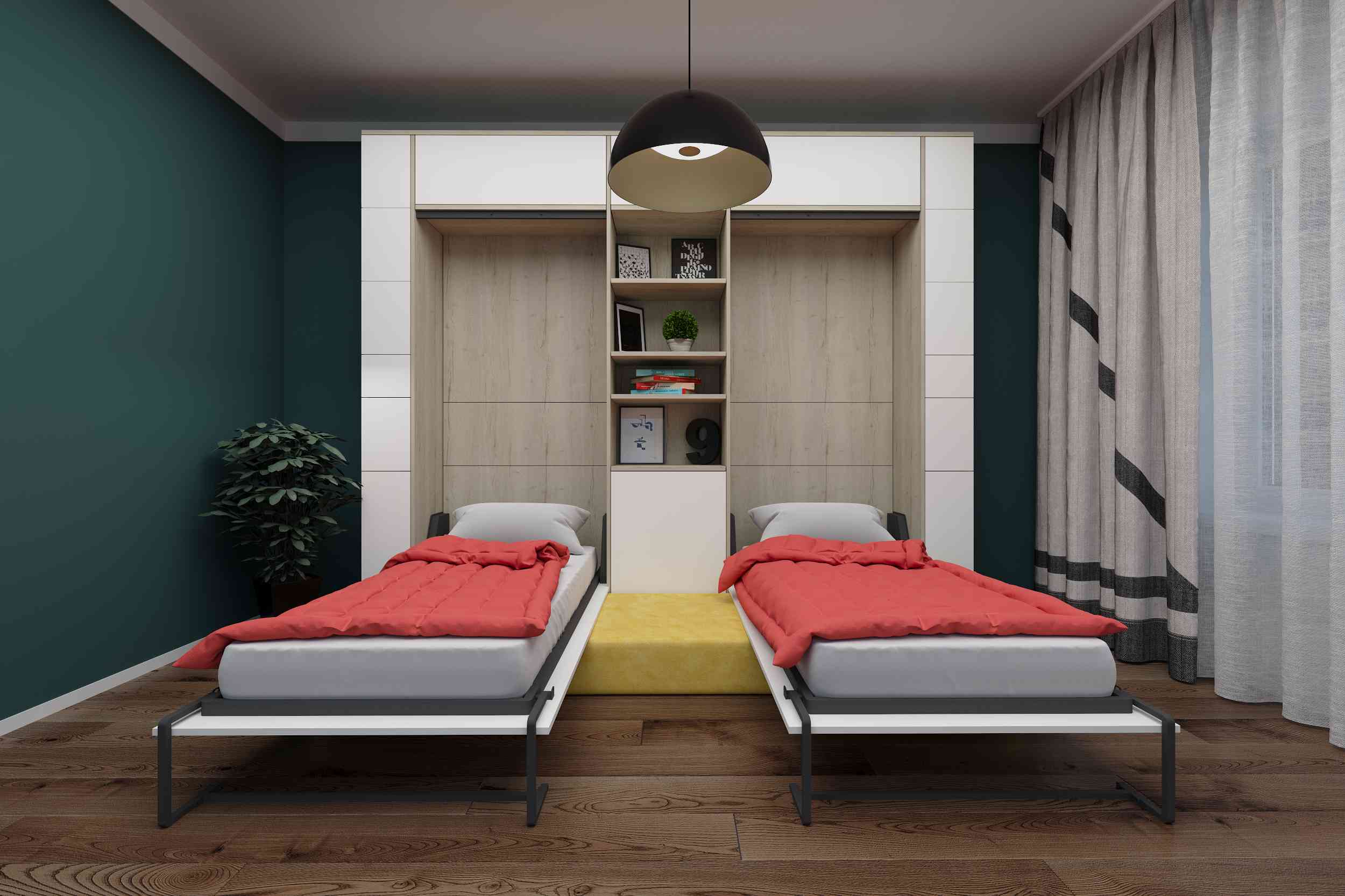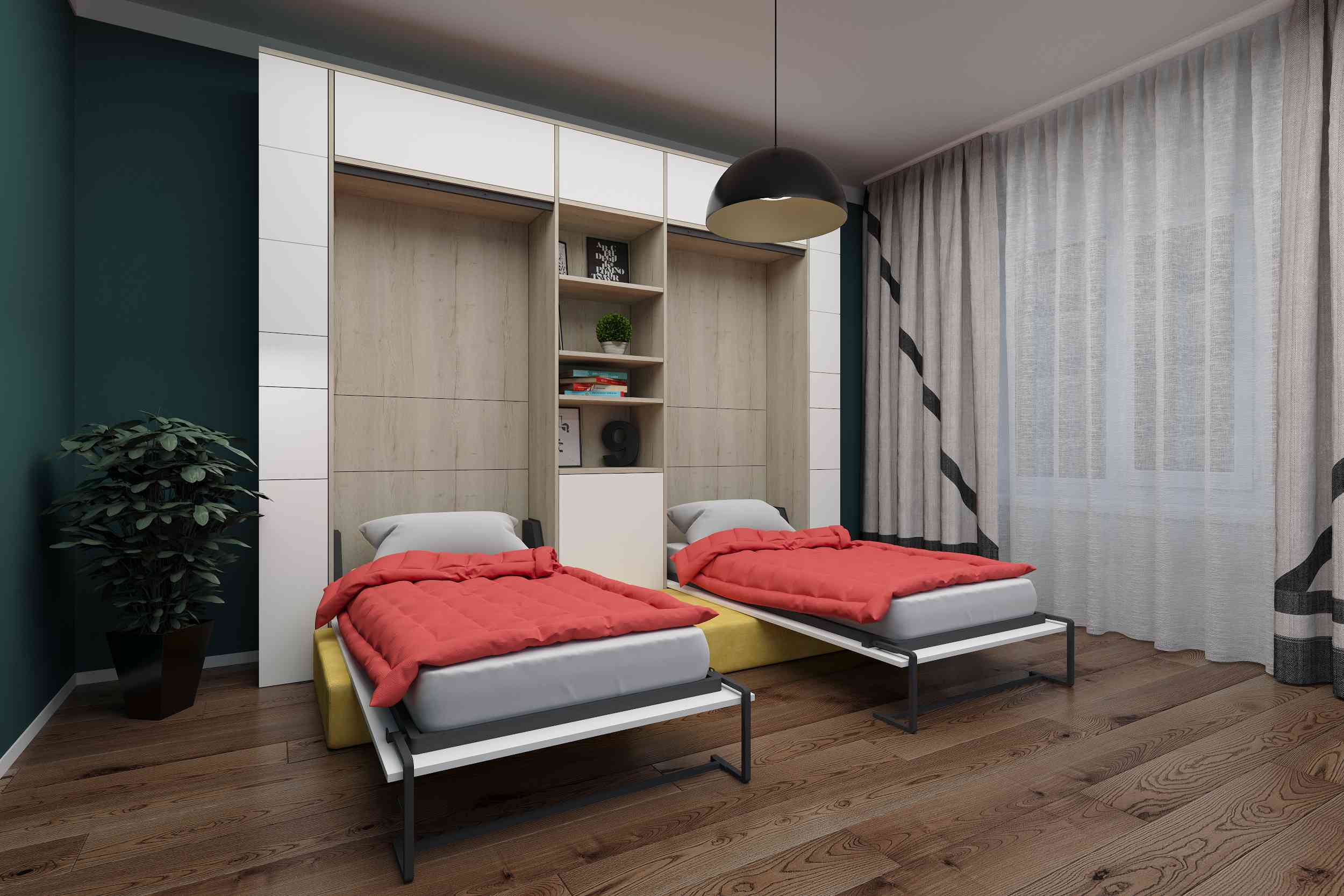2 кровати-трансформер, размер спального места 900х2000 мм с механизмом Гудини вертикального сложения. Материал изготовления ДСП Egger. Проект «Абсалон» выполнен по индивидуальному заказу. Общий размер конструкции 3240* 450*2600 мм