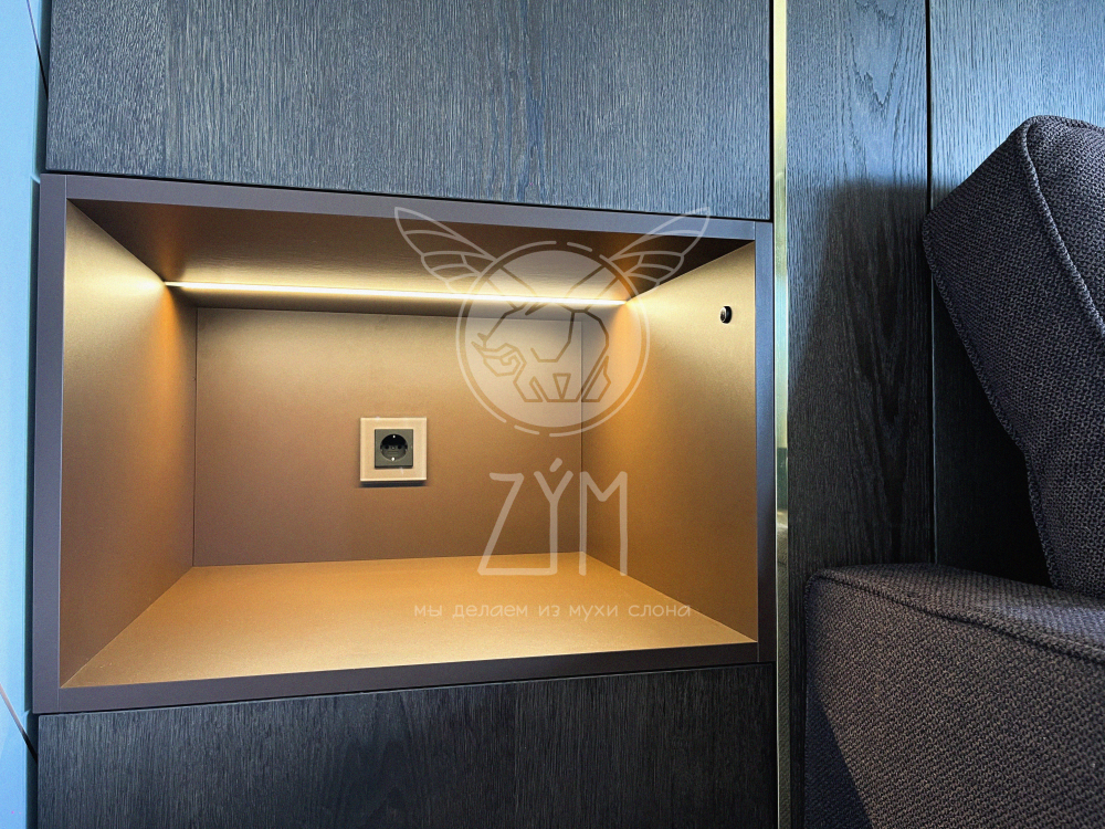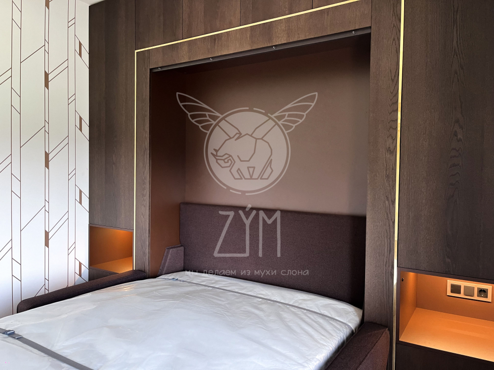 Мебель-трансформер с кроватью вертикального сложения с интегрированной полкой. Включает подсветку, мягкое изголовье и много зон хранения.