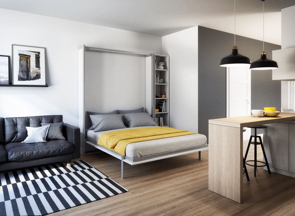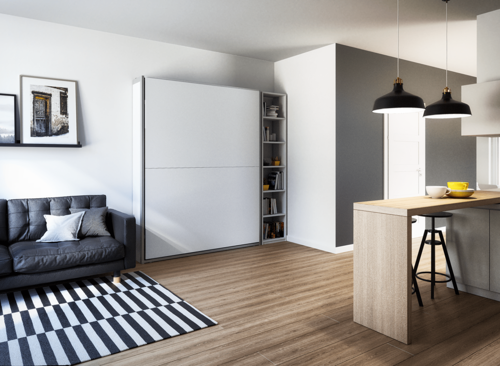 Мебель в гостиную включает шкаф-кровать вертикального сложения с сидением, подсветкой и мягким изголовьем, зону TV, закрытые зоны хранения.