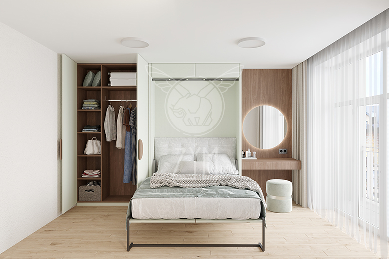 код 141840Мебель-трансформер для спальни включает шкаф-кровать с мягким изголовьем, полки, шкаф и консоль.