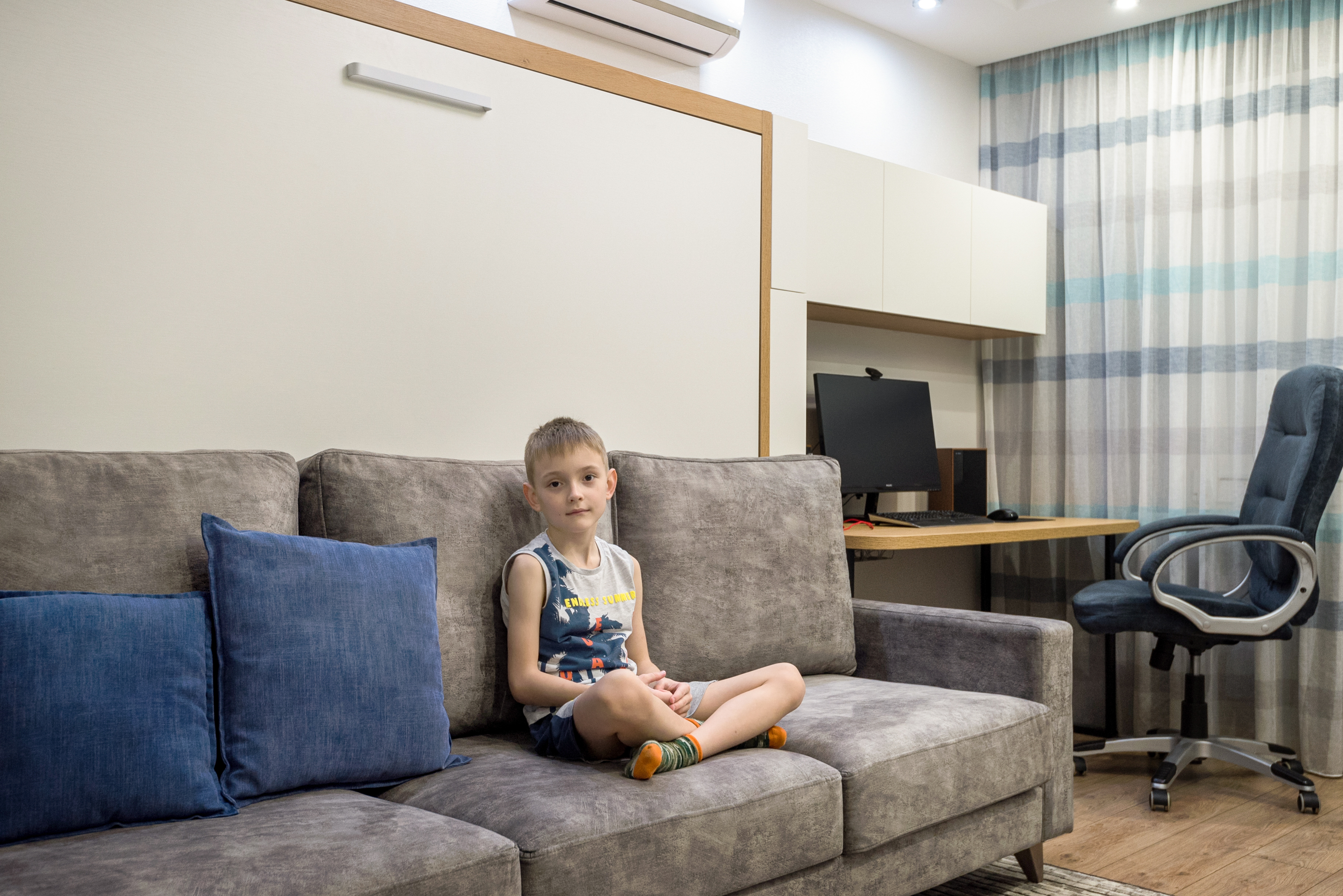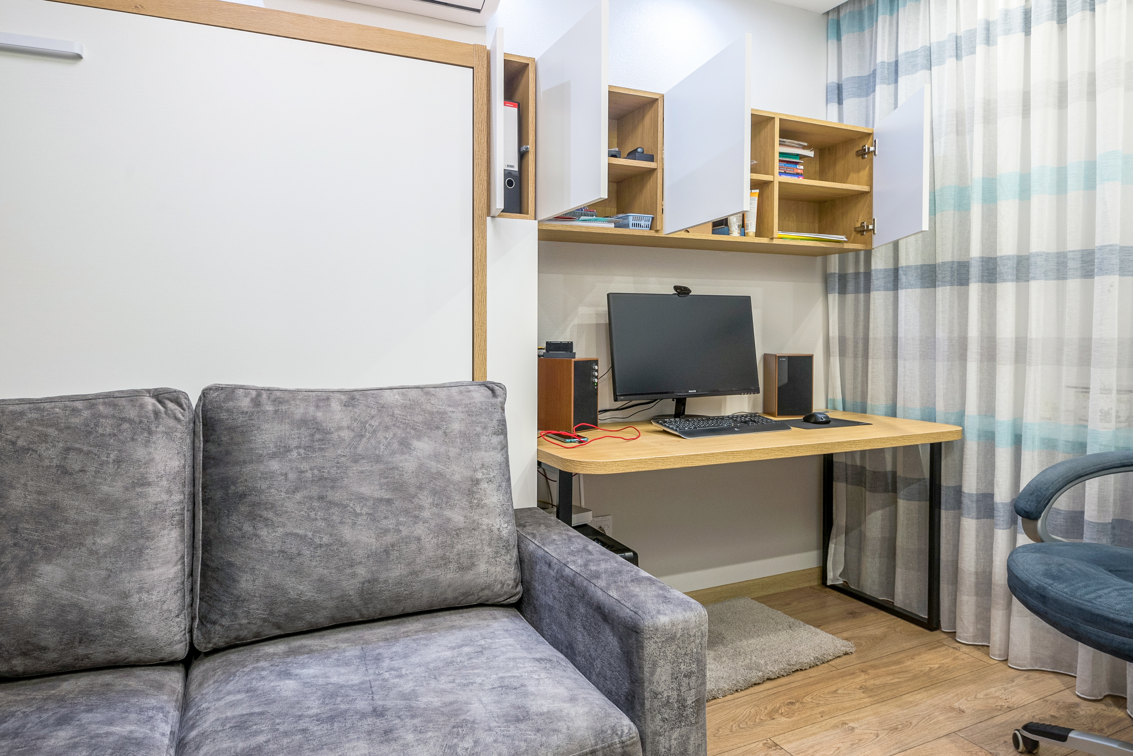 Кровать-трансформер, встроенная в шкаф с открытыми полками и ящиком для белья. Конструкция дополнена диванным модулем со съемными подушками и сидушками и рабочей зоной. Материал кровати - ДСП Egger.