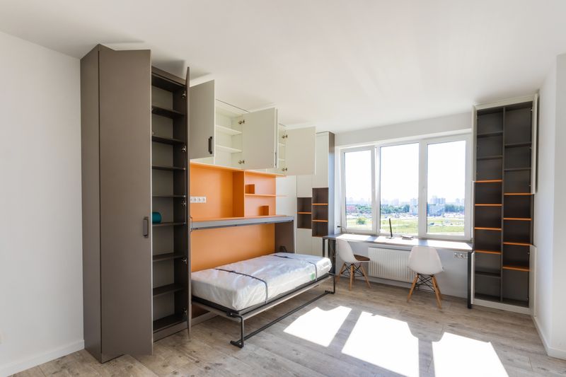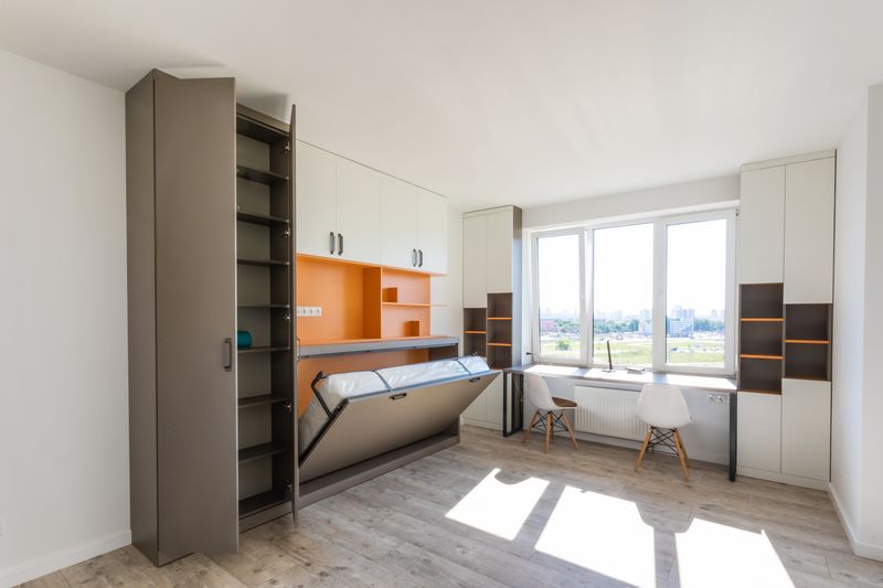 Мебель-трансформер для спальни включает шкаф-кровать с мягким изголовьем, полки, шкаф и консоль.