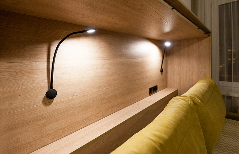 Кровать-трансформер в гостиную встроена в шкаф с подсветкой, мягким изголовьем и зонами для хранения. Материал кровати - ДСП.