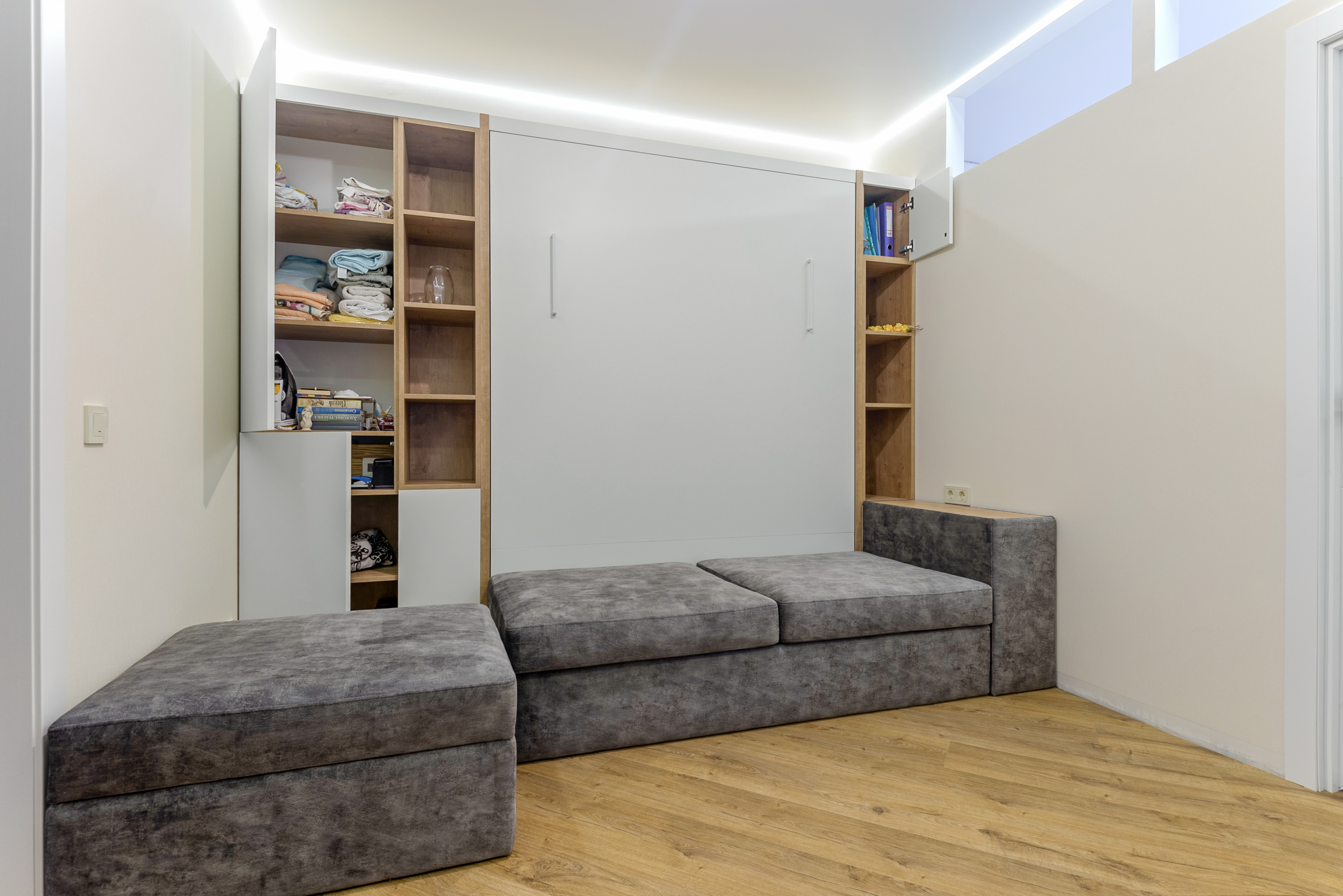 Стоимость дополнительных зон хранения и дивана рассчитывается дизайнером индивидуально на встрече. Учитываются размеры конструкции, выбранные материалы и фурнитура.