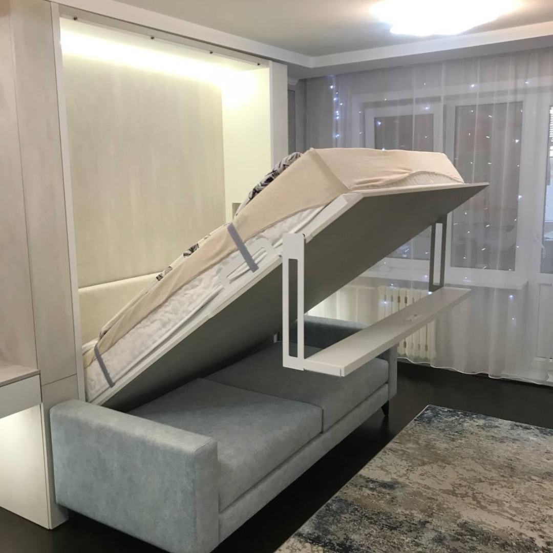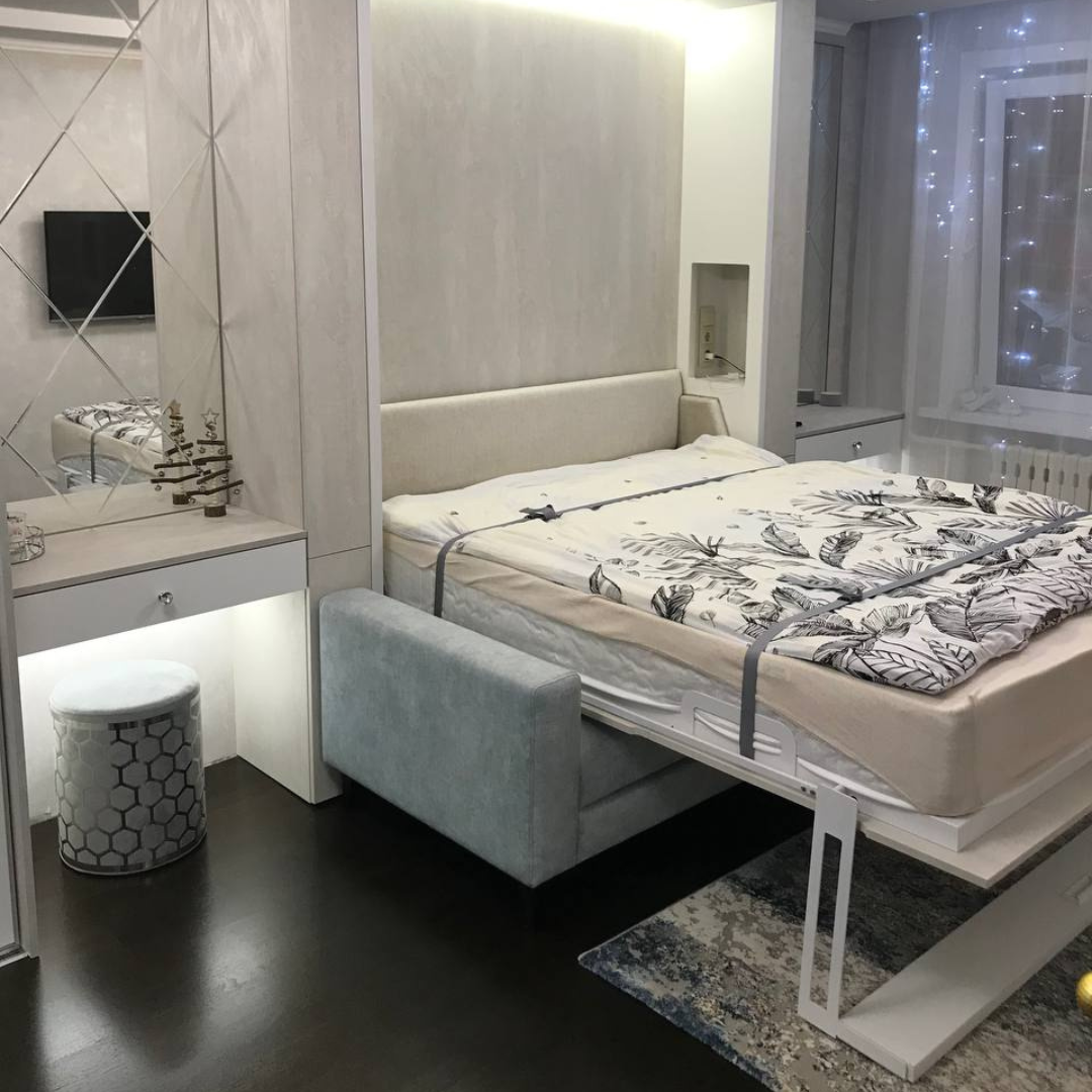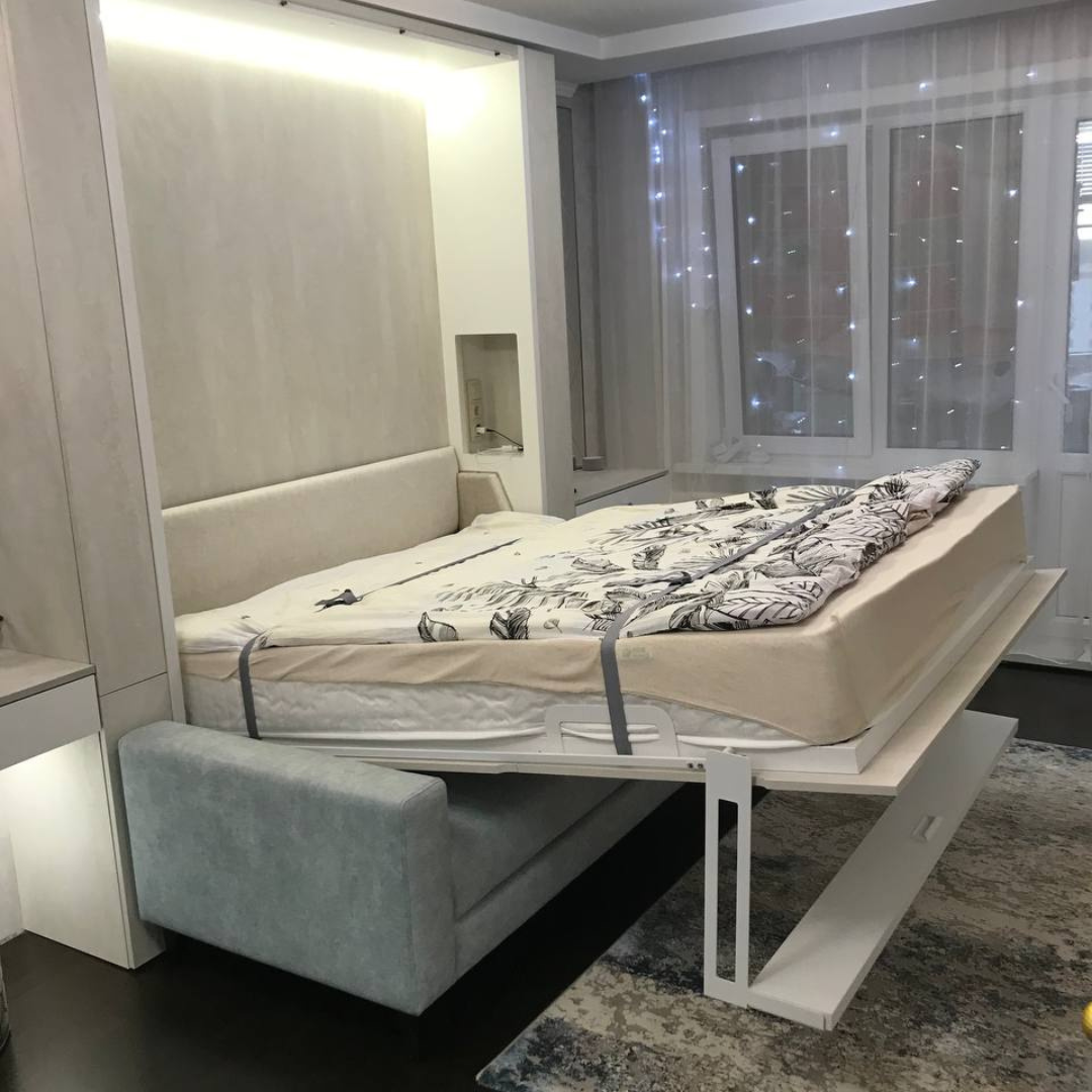 Мебель-трансформер с кроватью вертикального сложения с интегрированной полкой. Включает подсветку, мягкое изголовье и много зон хранения.