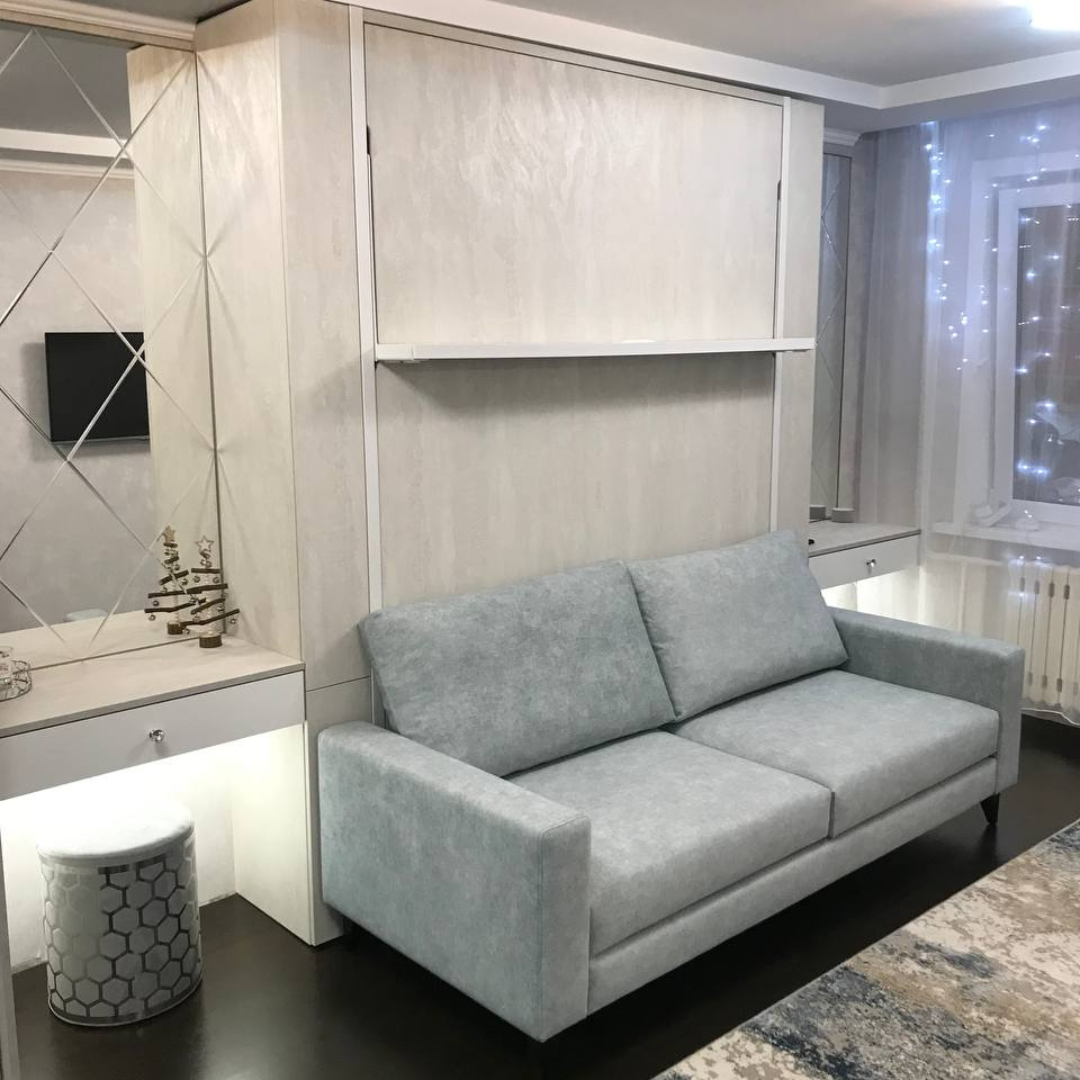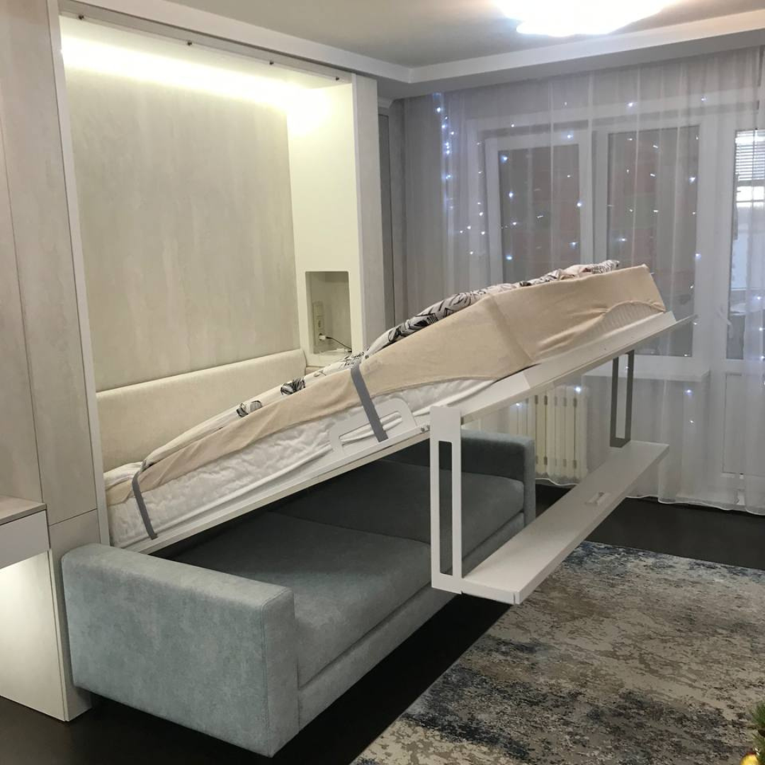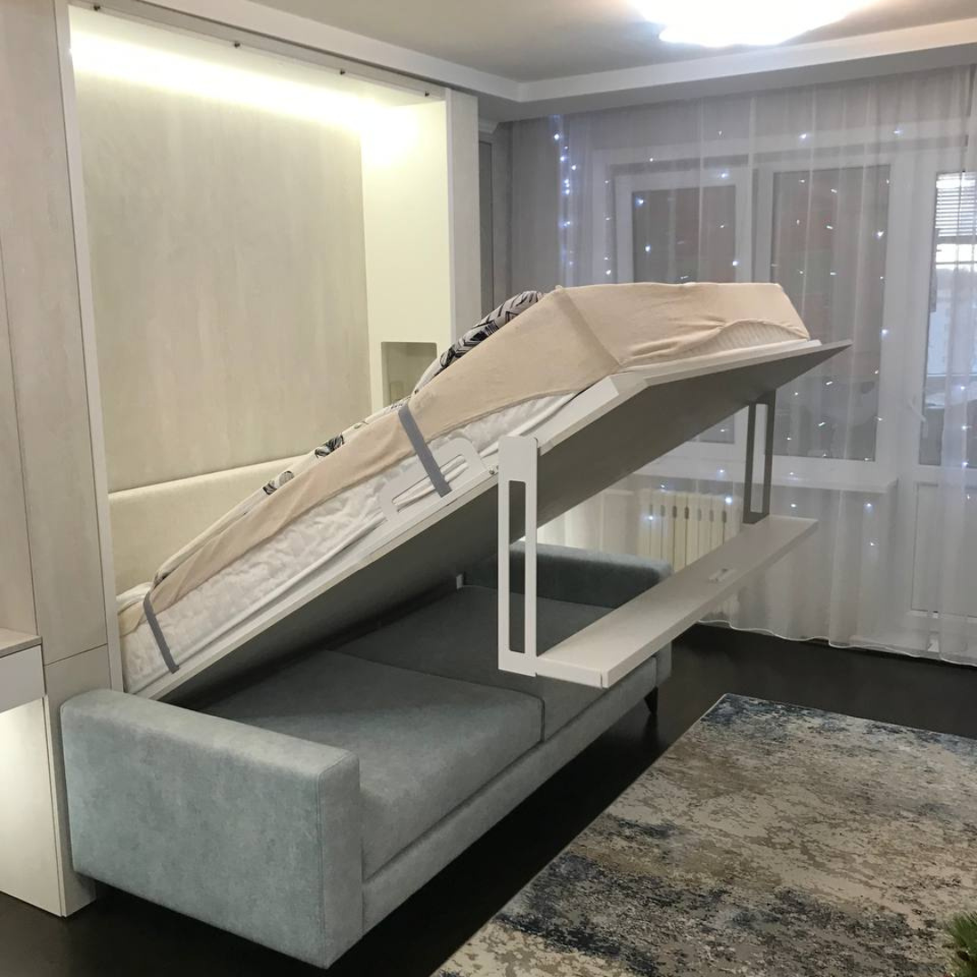 Мебель-трансформер с кроватью вертикального сложения с интегрированной полкой. Включает подсветку, мягкое изголовье и много зон хранения.