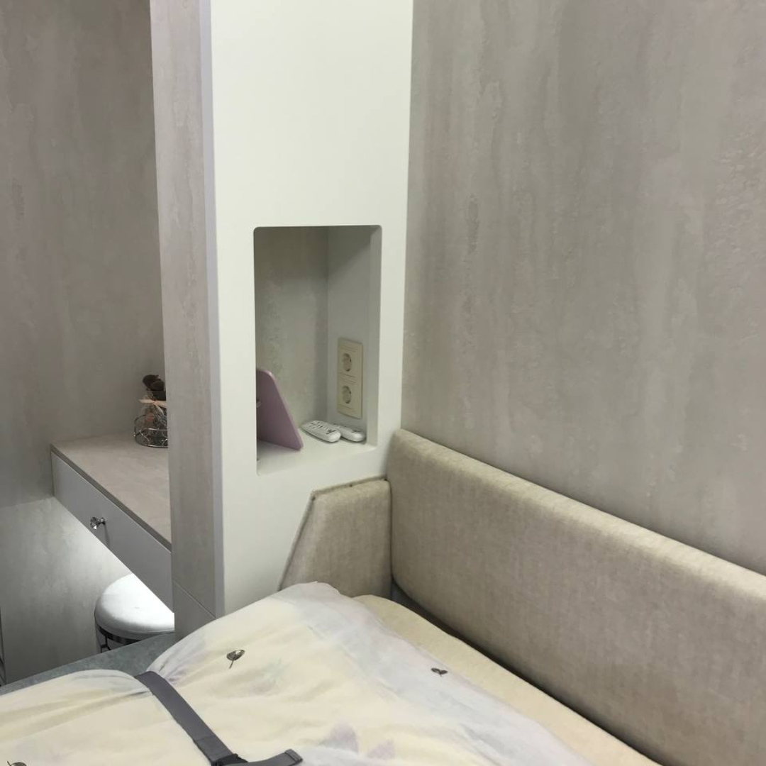 - Изголовье и декоративная обшивка в одной ткани (ткань микровелюр, кстати тренд 2023 года);