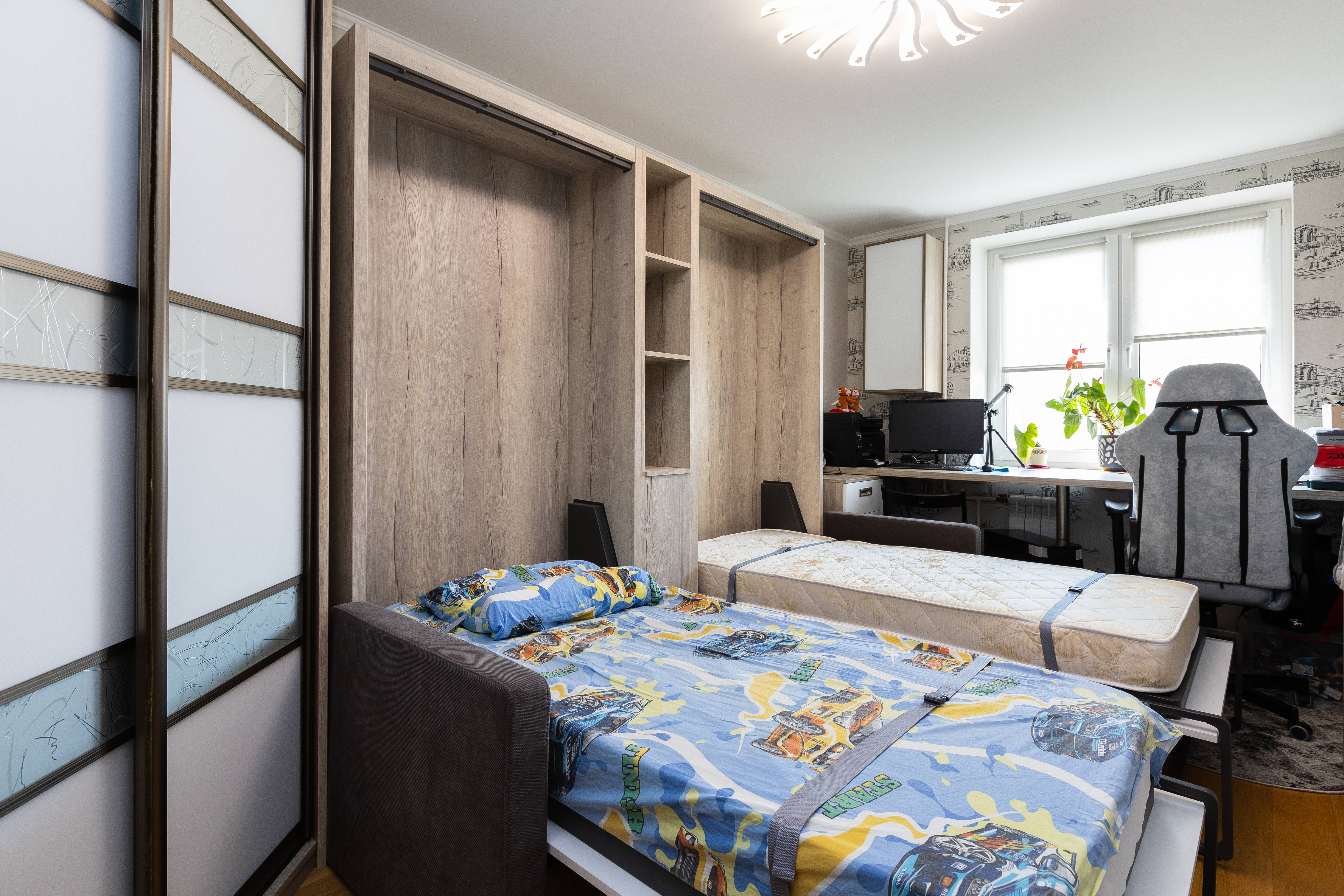 Кровати-трансформеры с механизмом Гудини вертикального сложения. Размер спального места — 900х1900 мм. Материал — ДСП Egger. Проект «Мортео» сделан по индивидуальному заказу. Общие размеры конструкции: 2430х435х2160 мм.