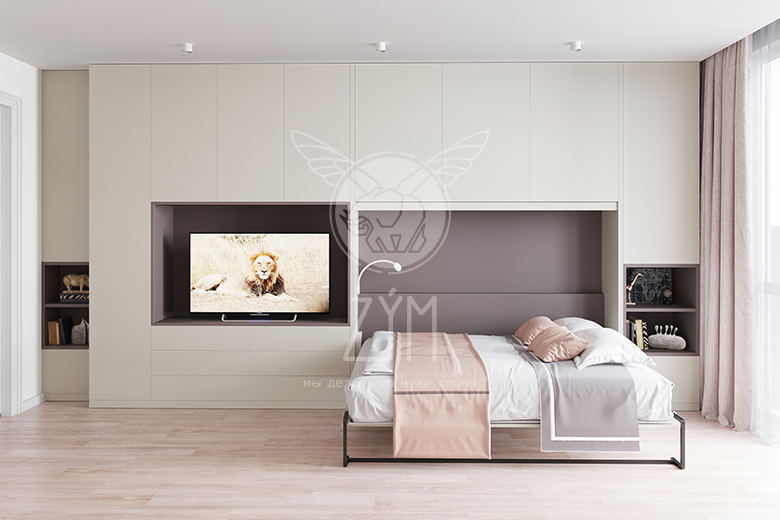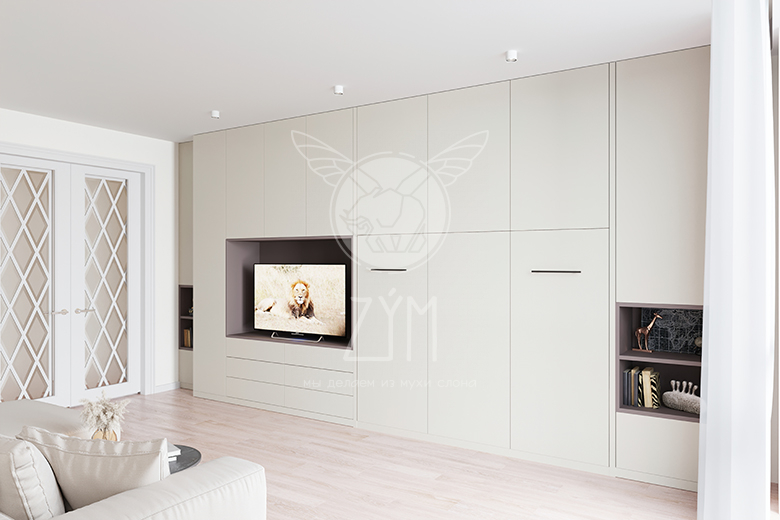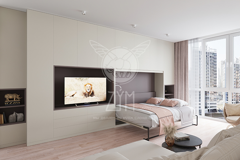 Мебель-трансформер со шкафом-кроватью горизонтального сложения. Включает шкаф, открытые и закрытые зоны хранения, выдвижные ящики, нишу под телевизор