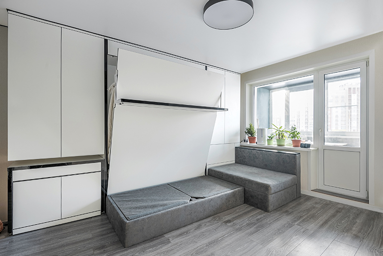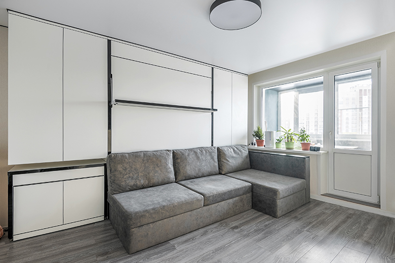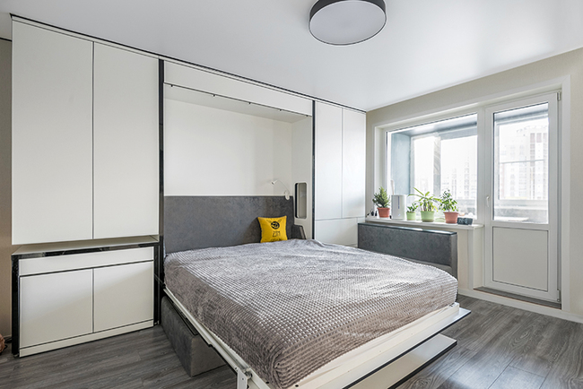 Комплект мебели включает шкаф и кровать-трансформер с диваном и закрытыми зонами для хранения из ДСП Egger.