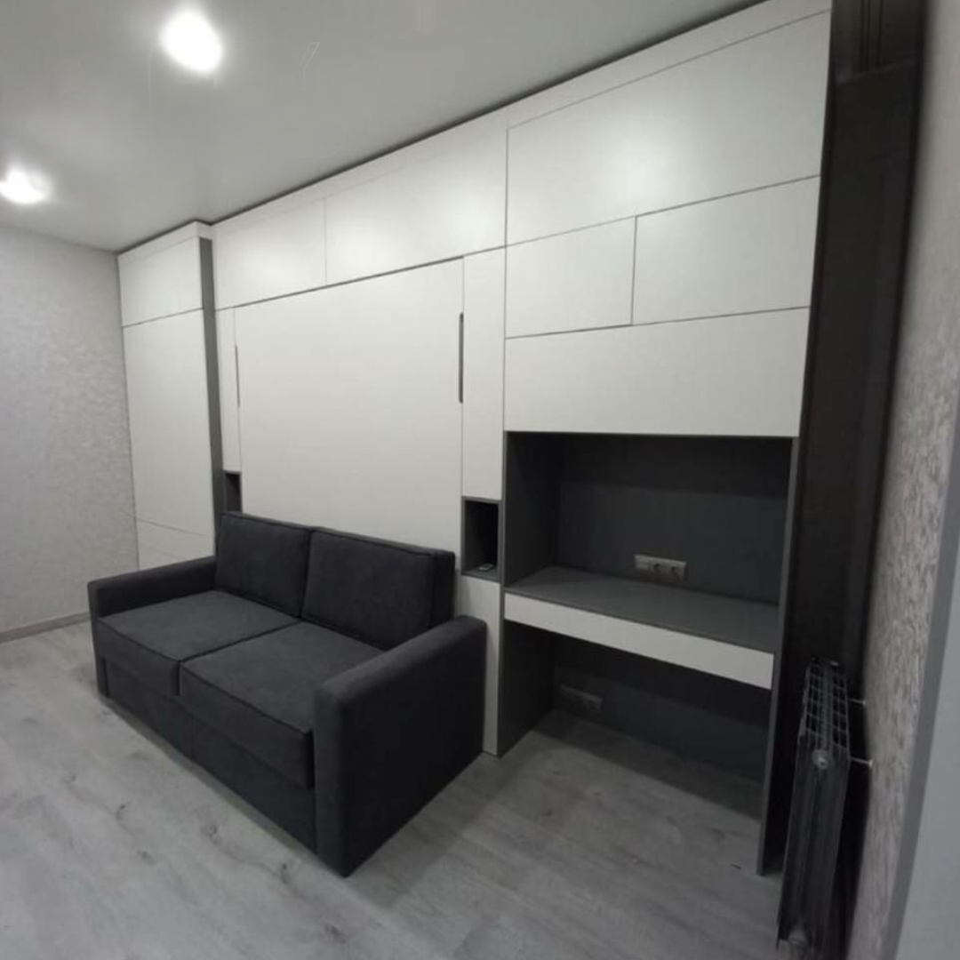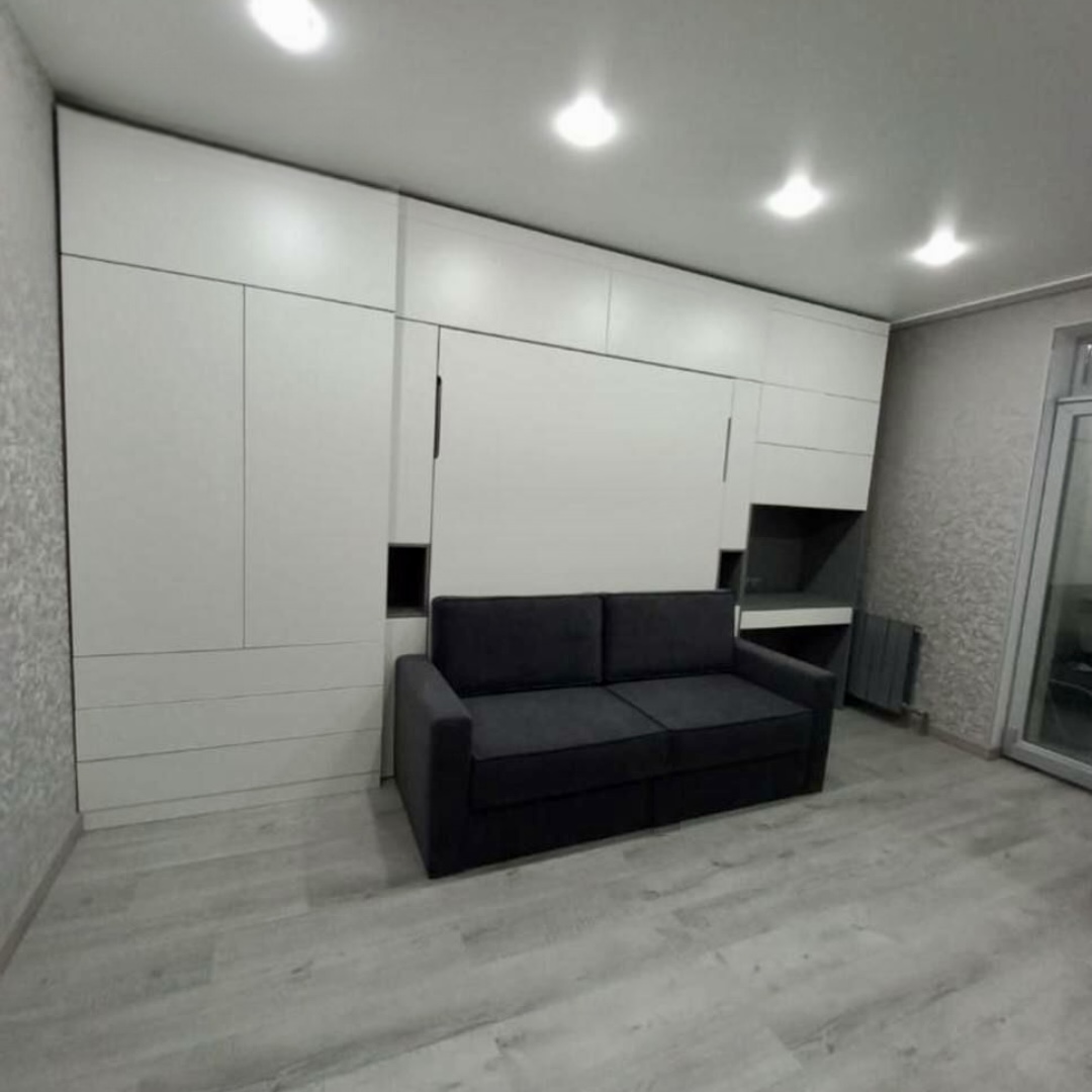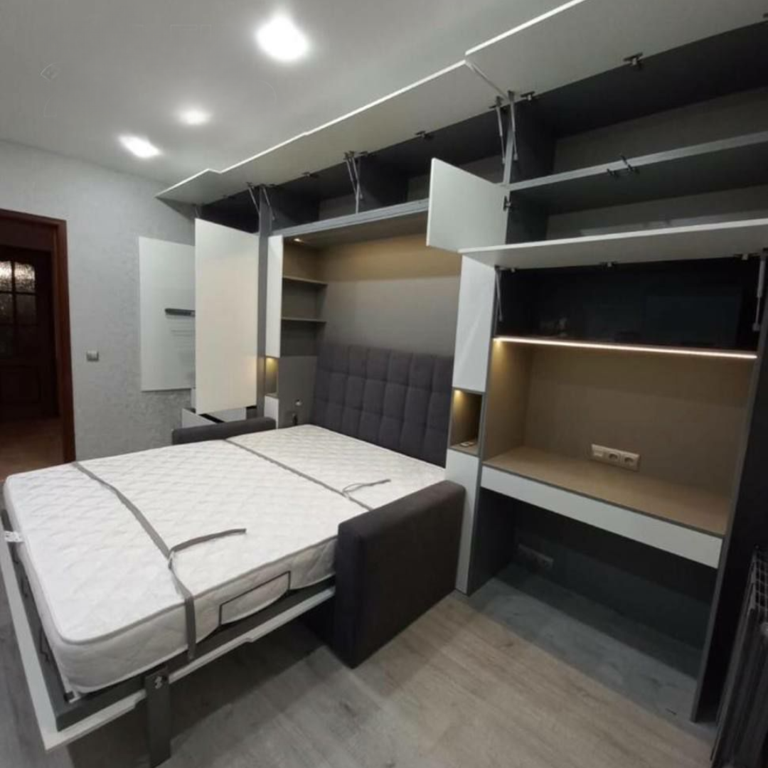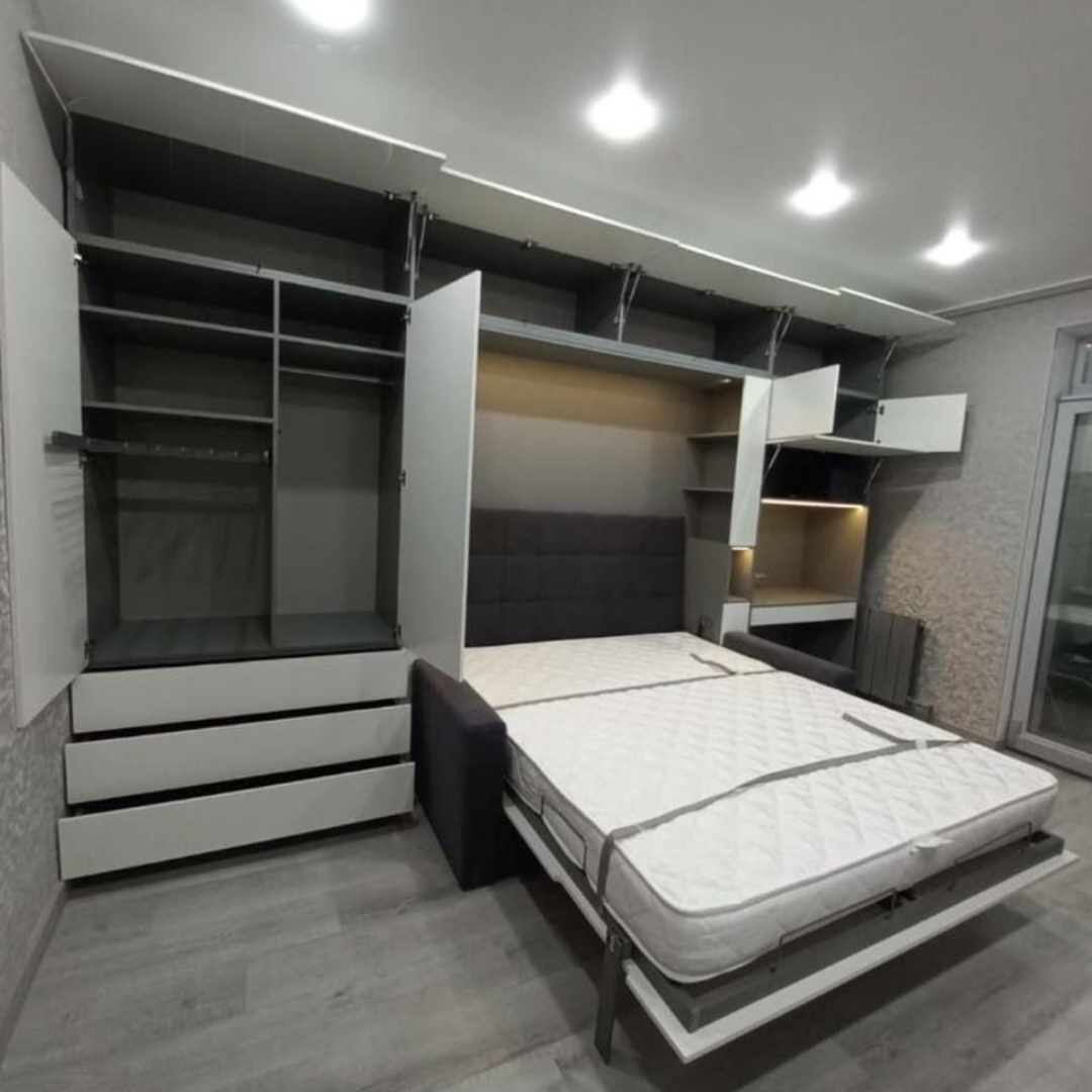 Шкаф-кровать из ЛДСП Эггер вертикального сложения. Включает закрытые зоны хранения вокруг кровати.