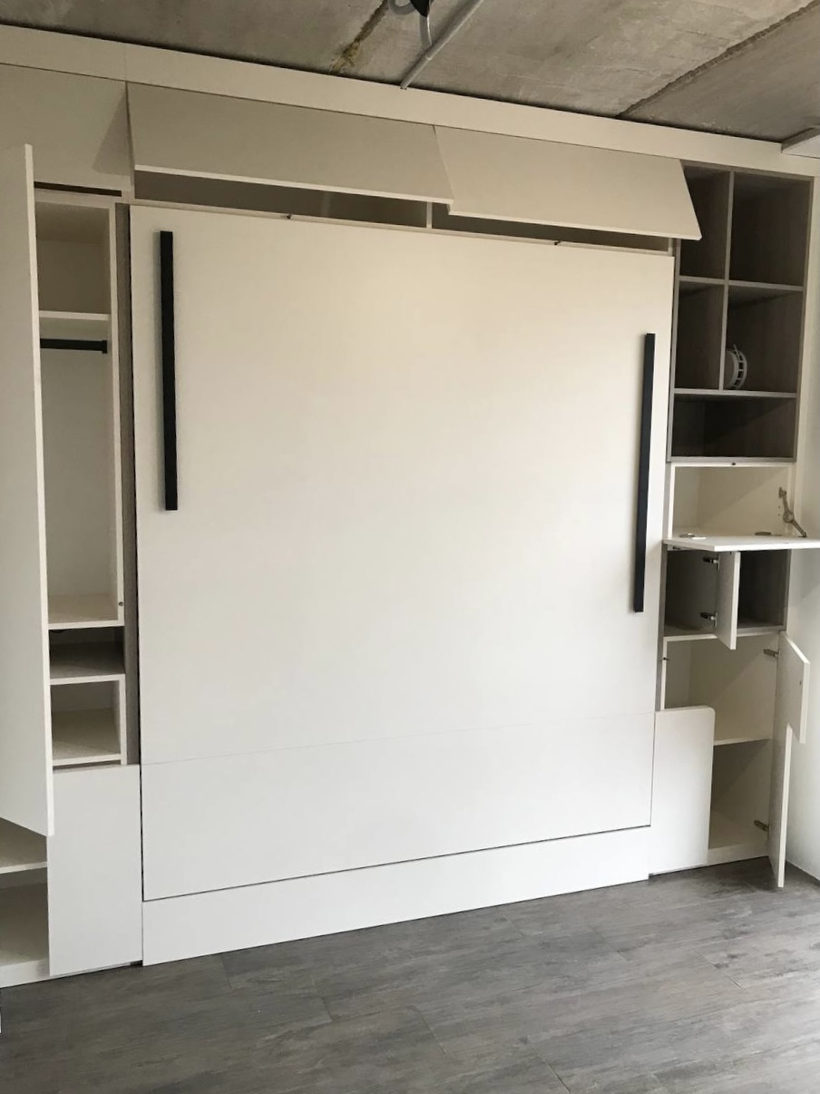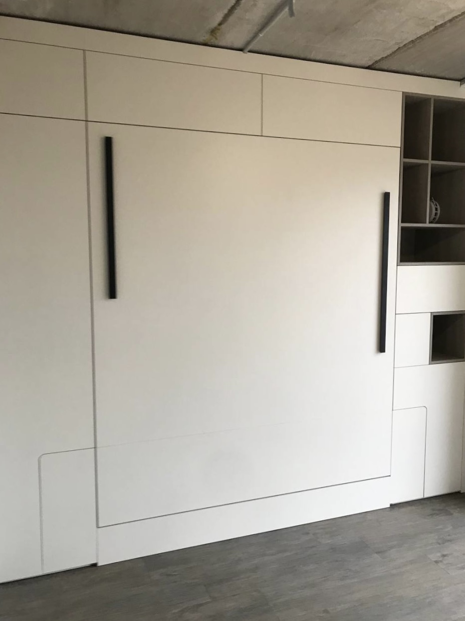 Кровать-трансформер. Встроенная в шкаф конструкция. Симметричные стеллажи-пеналы. Бесплатная консультация и выезд дизайнера. Фирменная рассрочка. Изготовление до 25 дней.