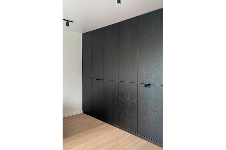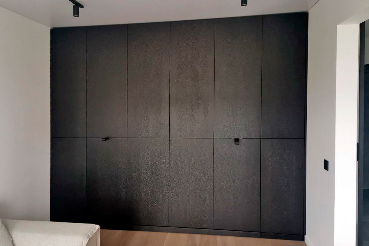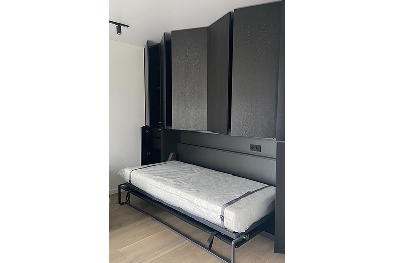 код 140327Встроенная мебель включает горизонтальную шкаф-кровать и закрытые зоны хранения. Материал - шпон эвкалипта.