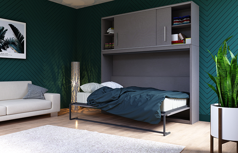 Шкаф-кровать из ДСП Egger с открытыми и закрытыми зонами для хранения и диванным модулем.