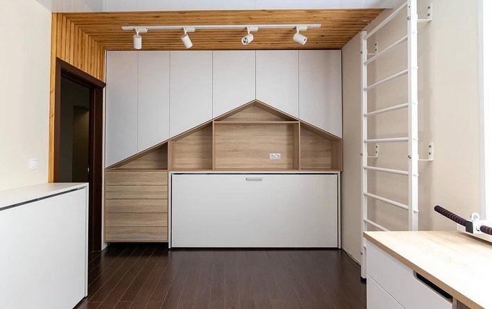 Гарнитур из односпальной кровати-трансформер с зонами хранения, плавно переходящий в рабочую зону.