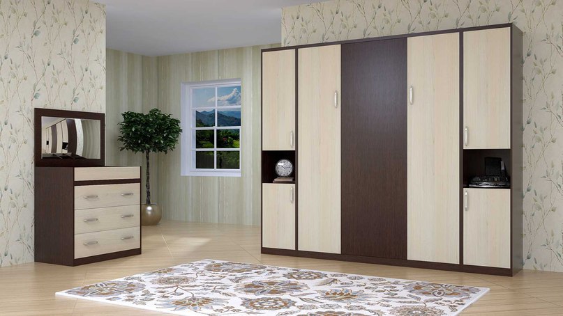 Гостиная из ЛДСП Egger с кроватью-трансформером, витриной, зоной для хранения, шкафом, тумбой под телевизор.