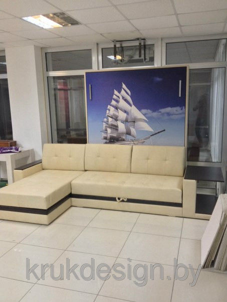 Изысканная подъемная шкаф-кровать с диваном «Премьер» отличается красочным фасадом, на котором изображен мощный парусный корабль. В сложенном виде конструкция представляет собой компактный шкаф с лаконичным диванчиком, в одной из боковин которого выполнен оригинальный столик для аксессуаров.