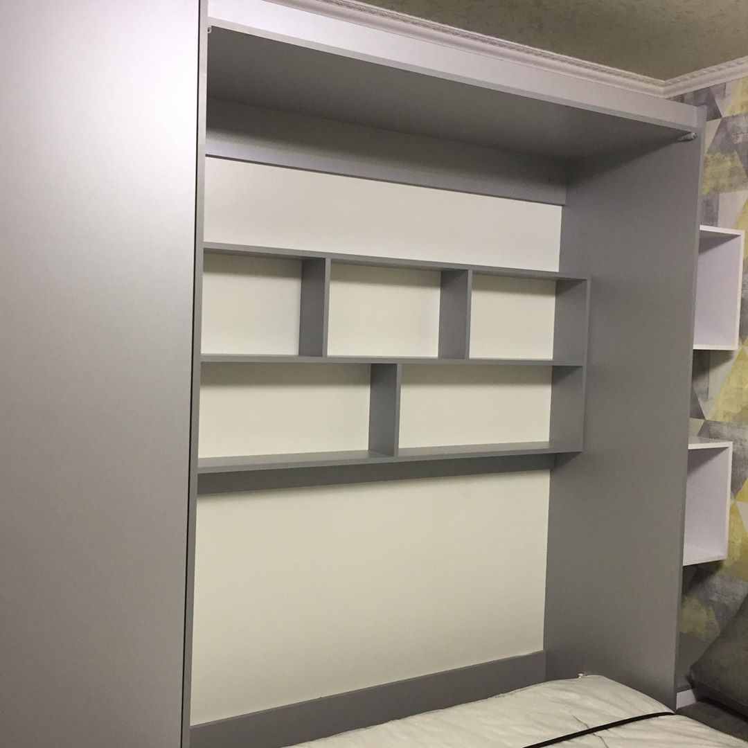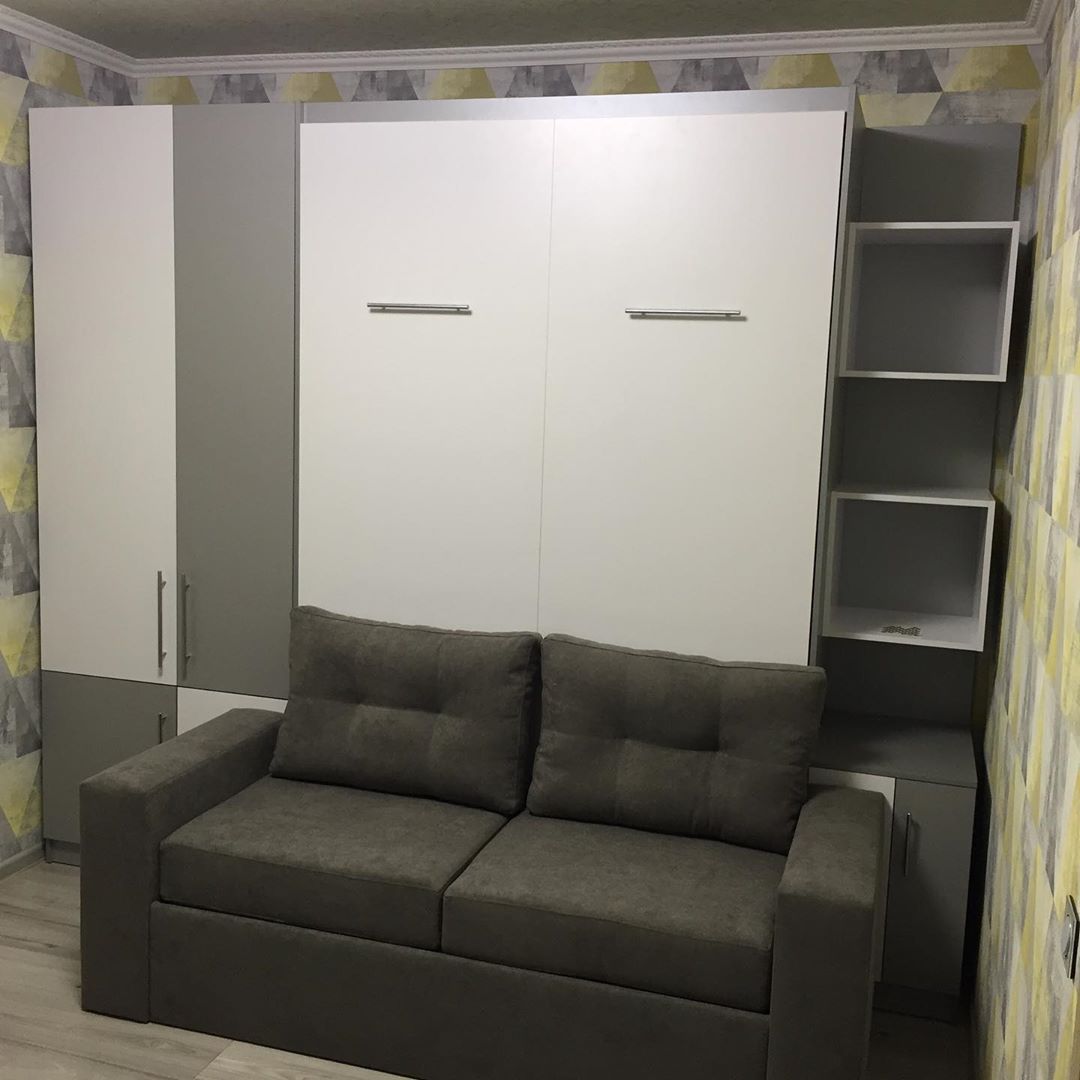 Подъемная шкаф-кровать с полками и диваном
