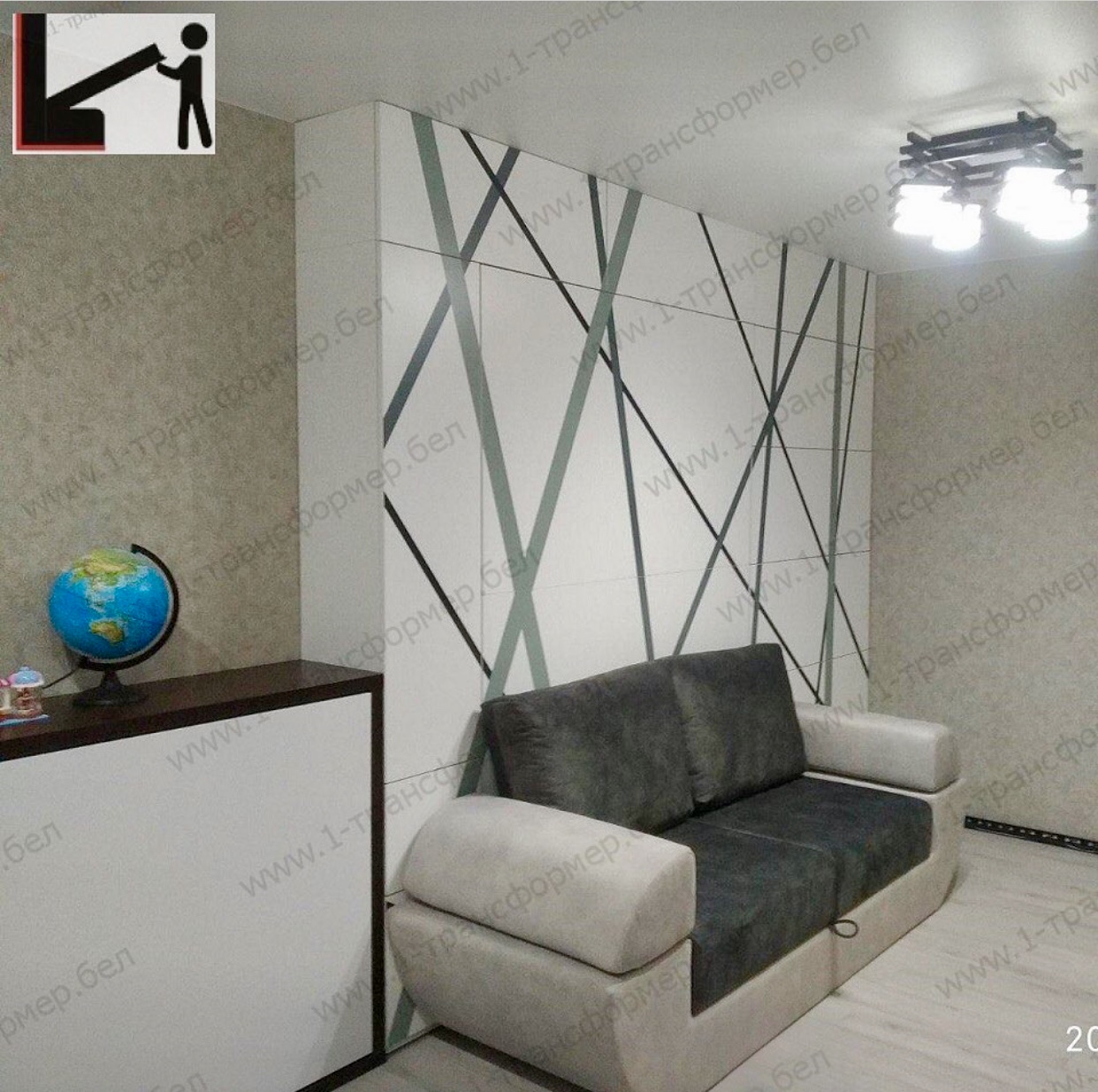 Гостиная из ЛДСП Egger с кроватью-трансформером, витриной, зоной для хранения, шкафом, тумбой под телевизор.