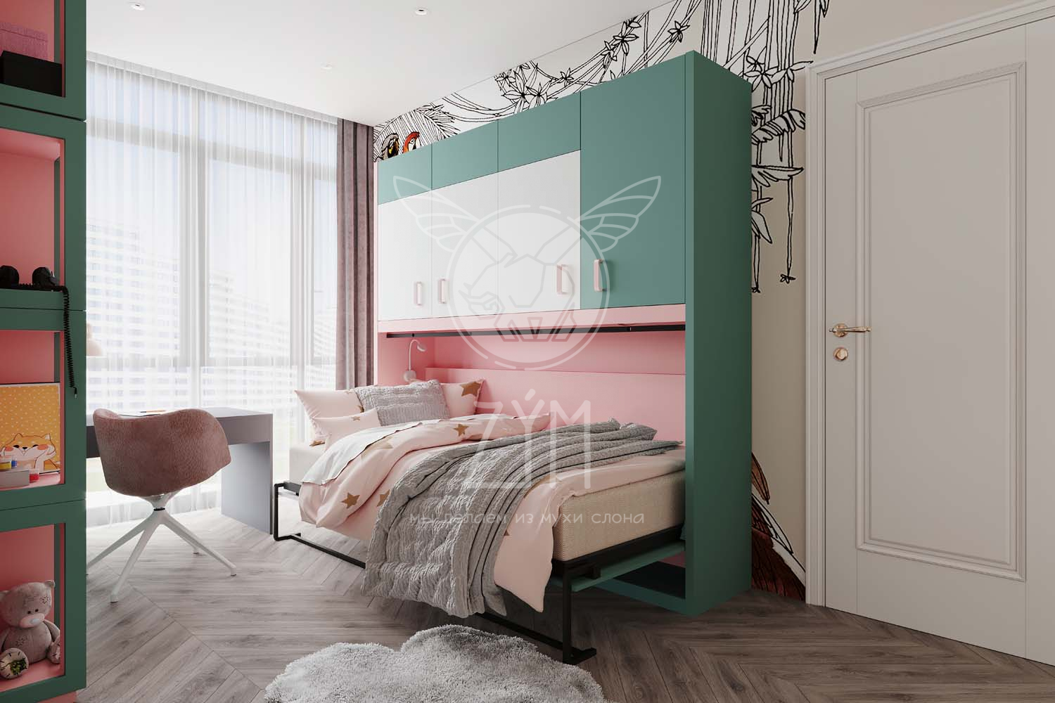 Шкаф-кровать из ЛДСП Эггер вертикального сложения. Включает закрытые зоны хранения вокруг кровати.