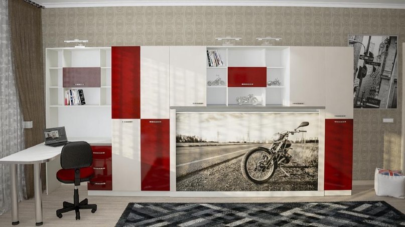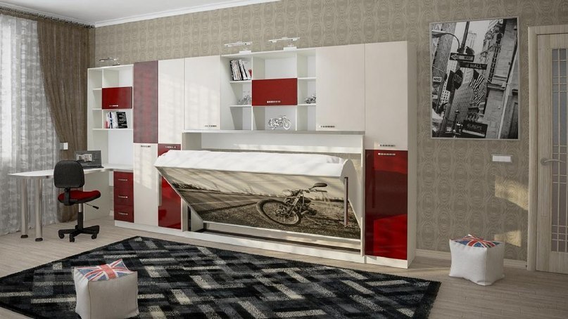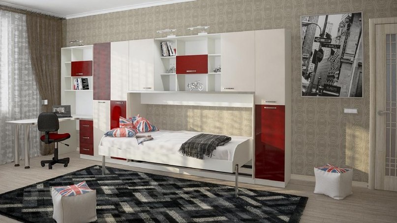Односпальная кровать по одному из боков легко складывается в корпус стенки, оборудованной полками, отделениями для гардероба и угловым рабочим столом.
