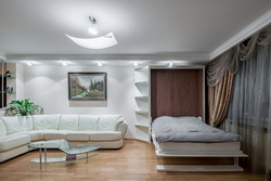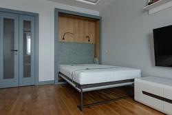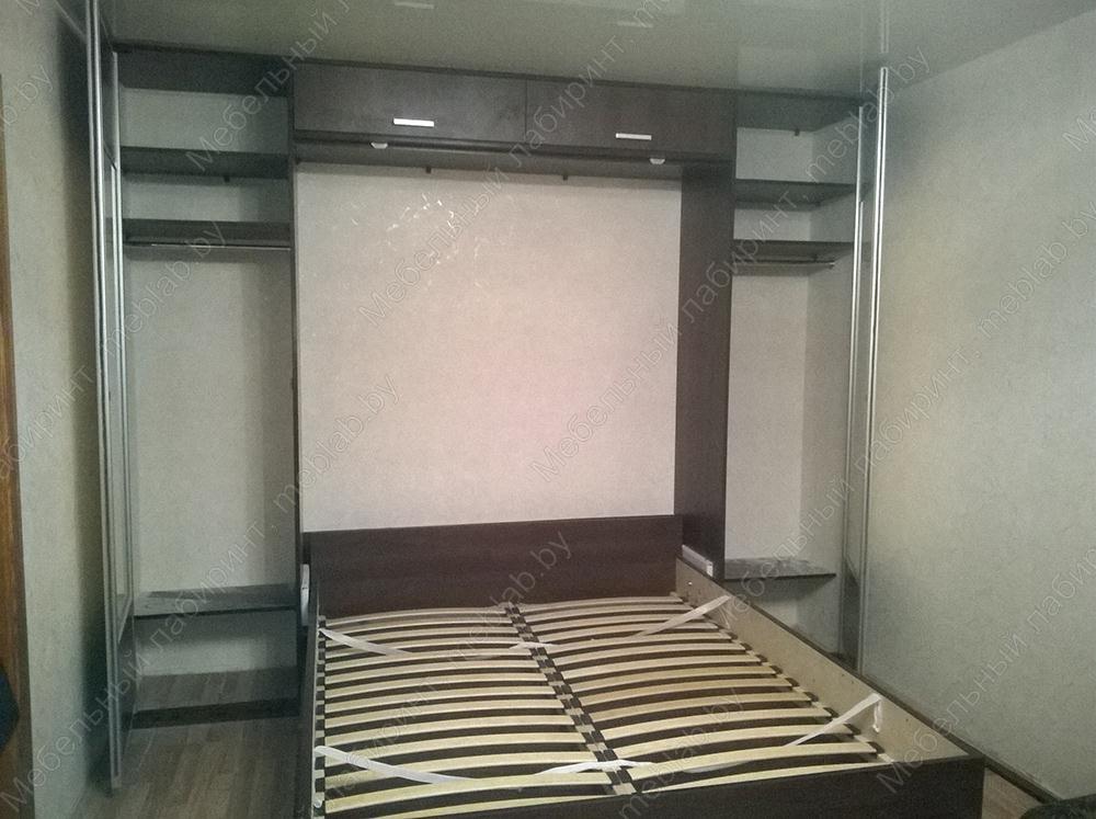 Удачным решением для небольшой квартиры станет двуспальная кровать, которая с легкостью убирается в шкаф. Специальный подъемный механизм основания позволит с минимальными усилиями привести спальное место в вертикальное положение. По бокам кровати расположены шкафчики с вместительными полками и штангами для одежды.