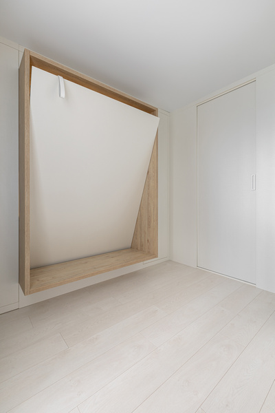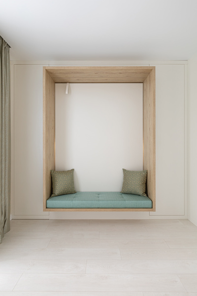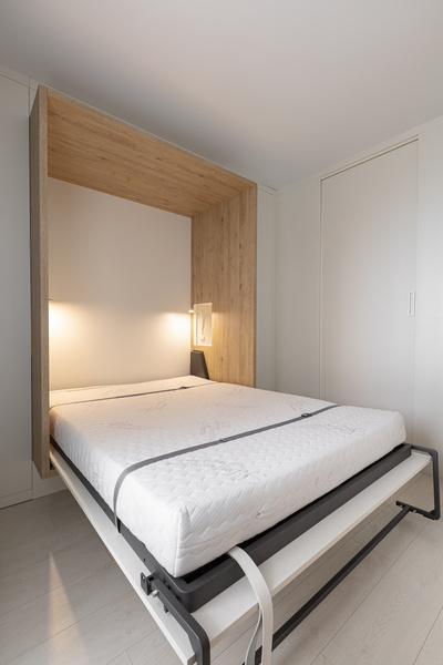 Встроенная мебель включает горизонтальную шкаф-кровать и закрытые зоны хранения. Материал - шпон эвкалипта.