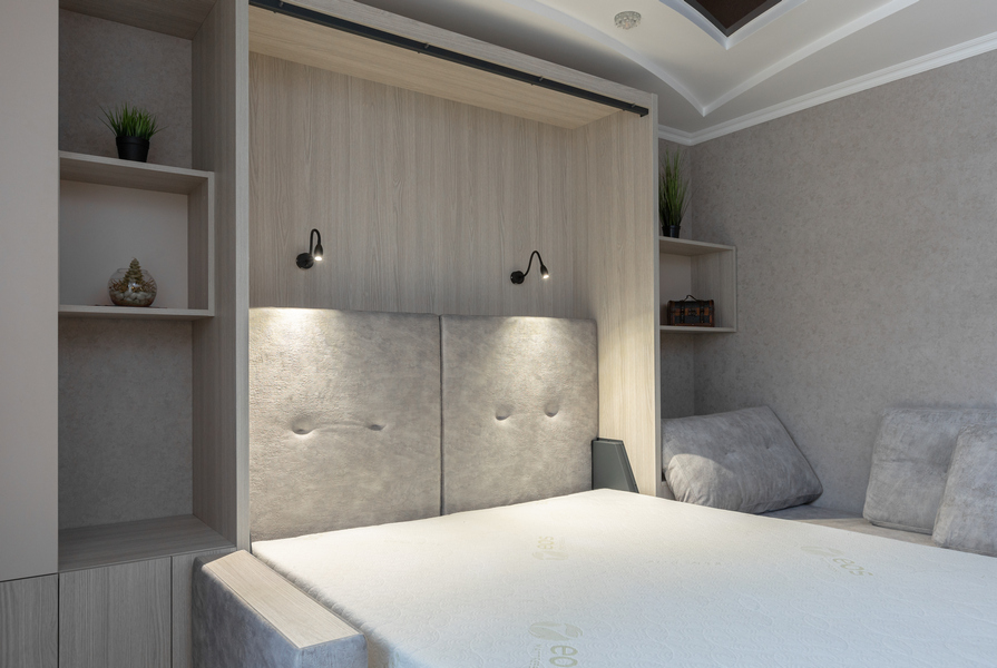 Двуспальная кровать-трансформер с мягким изголовьем, шкаф с открытыми и закрытыми зонами для хранения.