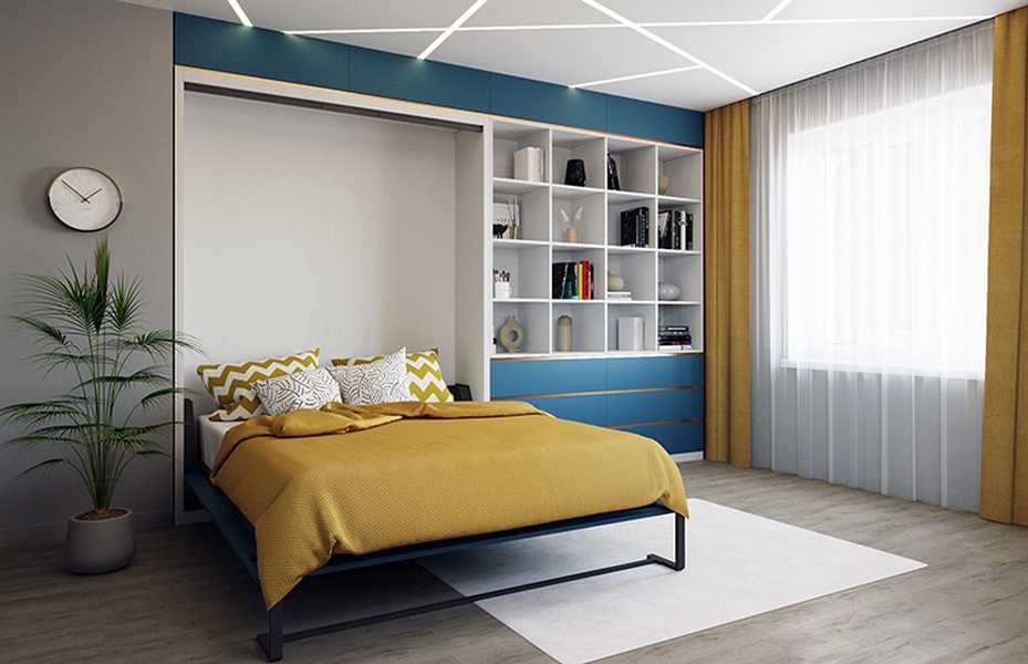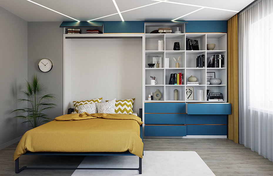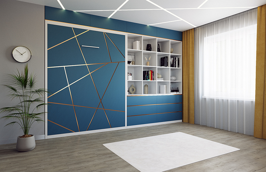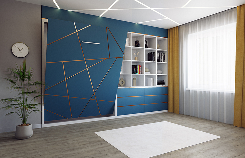 Мебель-трансформер из ЛДСП Эггер горизонтального сложения для детской с закрытыми и открытыми зонами хранения.
