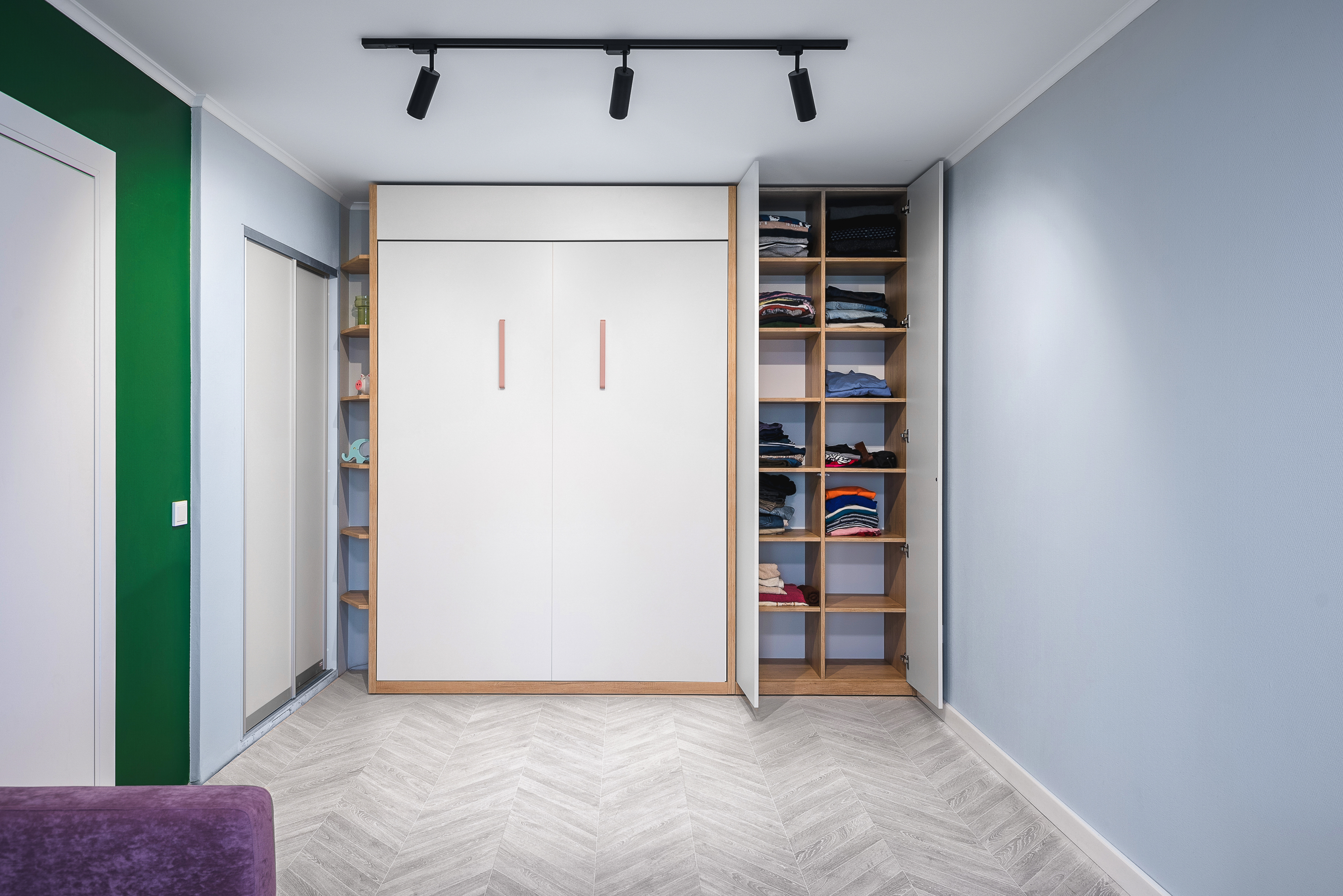 Кровать-трансформер с горизонтальным механизмом раскладывания встроена в шкаф с закрытыми полками в пределах доступности ребенка. Материал детской - крашенный МДФ.