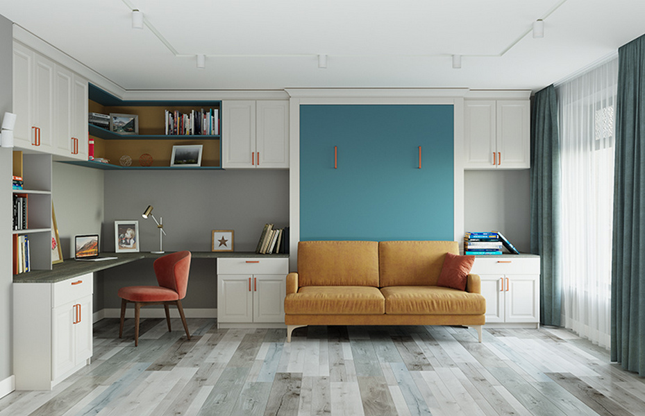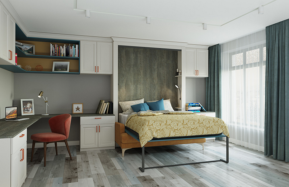 Кровать-трансформер, встроенная в шкаф с открытыми полками и ящиком для белья. Конструкция дополнена диванным модулем со съемными подушками и сидушками и рабочей зоной. Материал кровати - ДСП Egger.