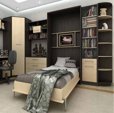 Кровать-диван с механизмом трансформации. Конструкция занимает всю стену и дополняется шкафом в нужном размере. Изготовление на заказ по индивидуальному дизайну.
