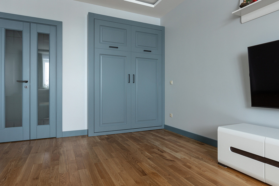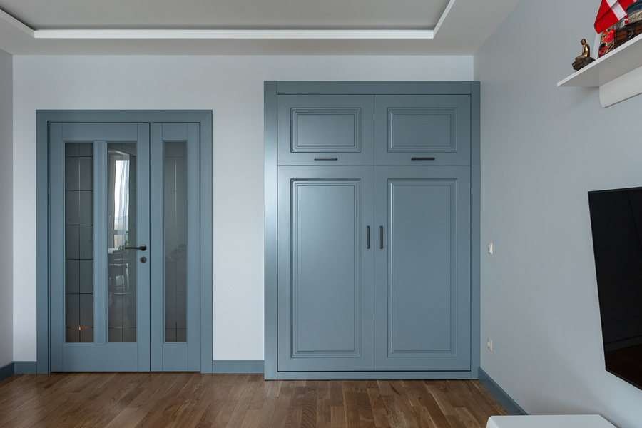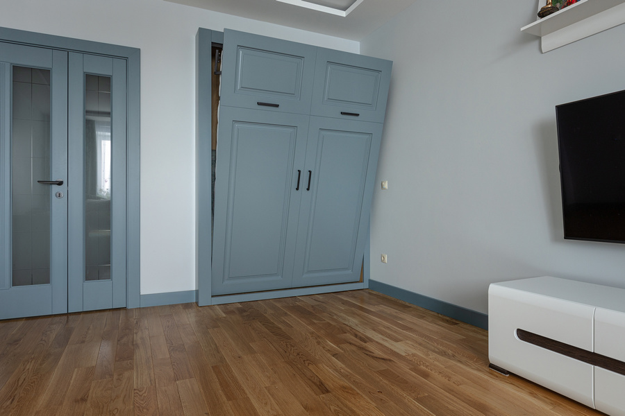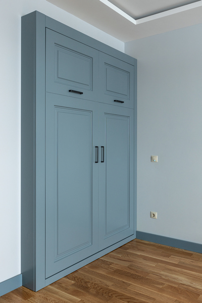Кровать-трансформер размером спального места 1400х2000 мм вертикального сложения c механизмом Гудини. Материал изготовления МДФ крашенный фрезерованный. Проект «Ривера» выполнен по индивидуальному заказу. Цена на сайте указана за кровать-трансформер (матрас в стоимость не входит).