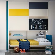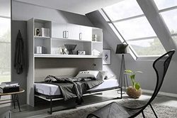 Детская кровать горизонтального сложения с навесным модулем из четырех полок.