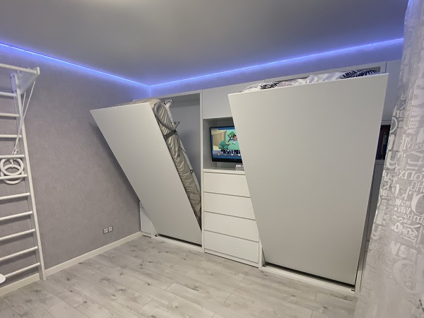 Надёжный и лёгкий механизм трансформации. Изготовление по индивидуальным размерам. Широкий выбор материалов.