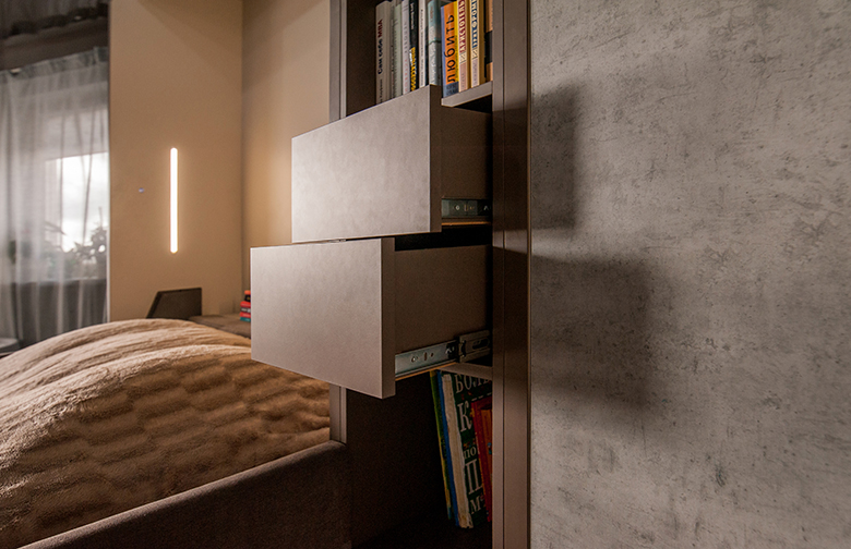 Модель трансформера из ЛДСП с диваном, зонами хранения, мягким изголовьем и зашивкой газовых лифтов.